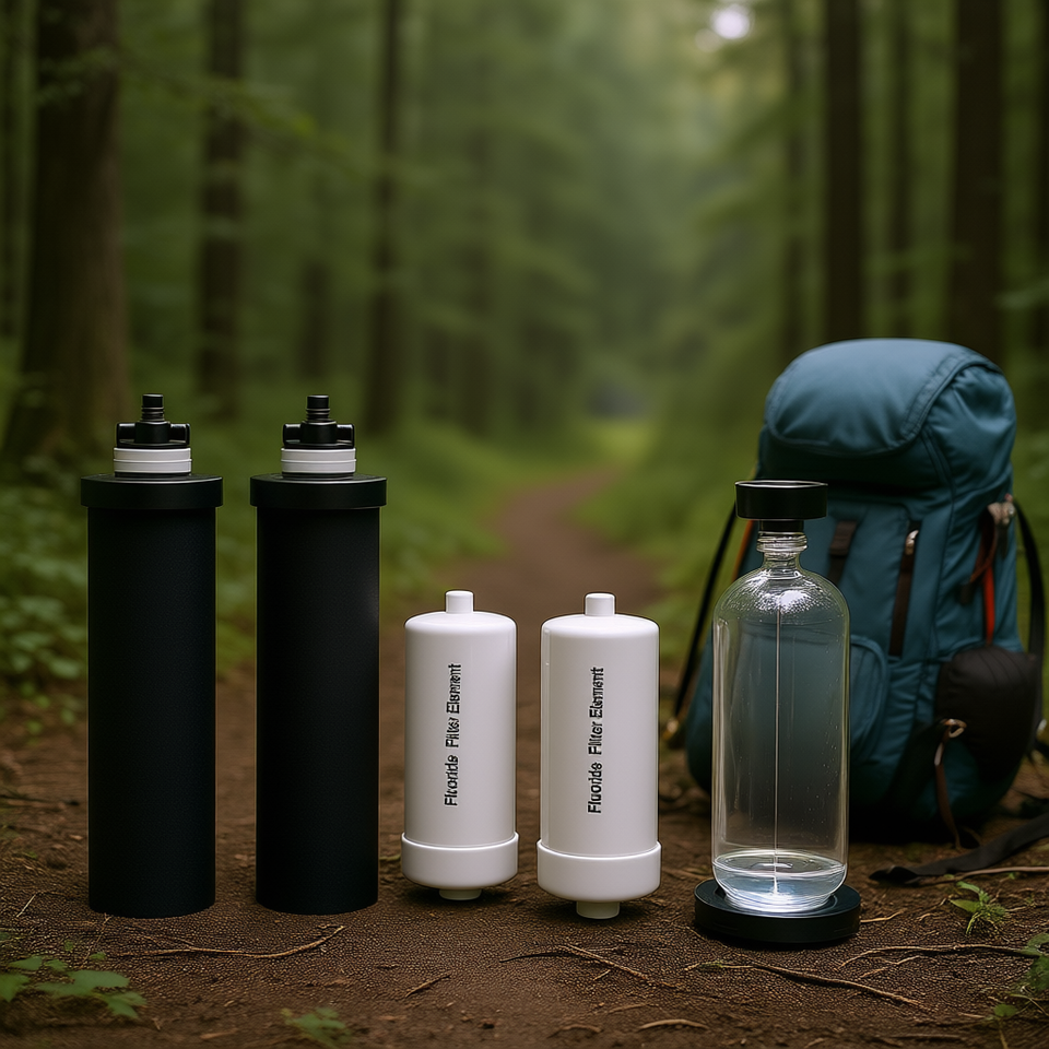 ตัวกรองน้ำกลางแจ้งแบบ 4 ชิ้น สำหรับเปลี่ยนในระบบกรองน้ำแบบแรงโน้มถ่วง พร้อมไส้กรองคาร์บอนกัมมันต์กำจัดฟลูออไรด์