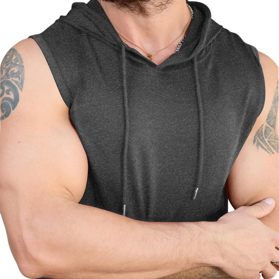เสื้อฮู้ดแขนกุดสำหรับผู้ชายสำหรับใส่กลางแจ้งเสื้อถักนิตติ้งปรับแต่งโลโก้ได้สำหรับฟิตเนสฟิตเนสฟิตเนสคอตตอนผสมดีไซน์ตามสั่ง