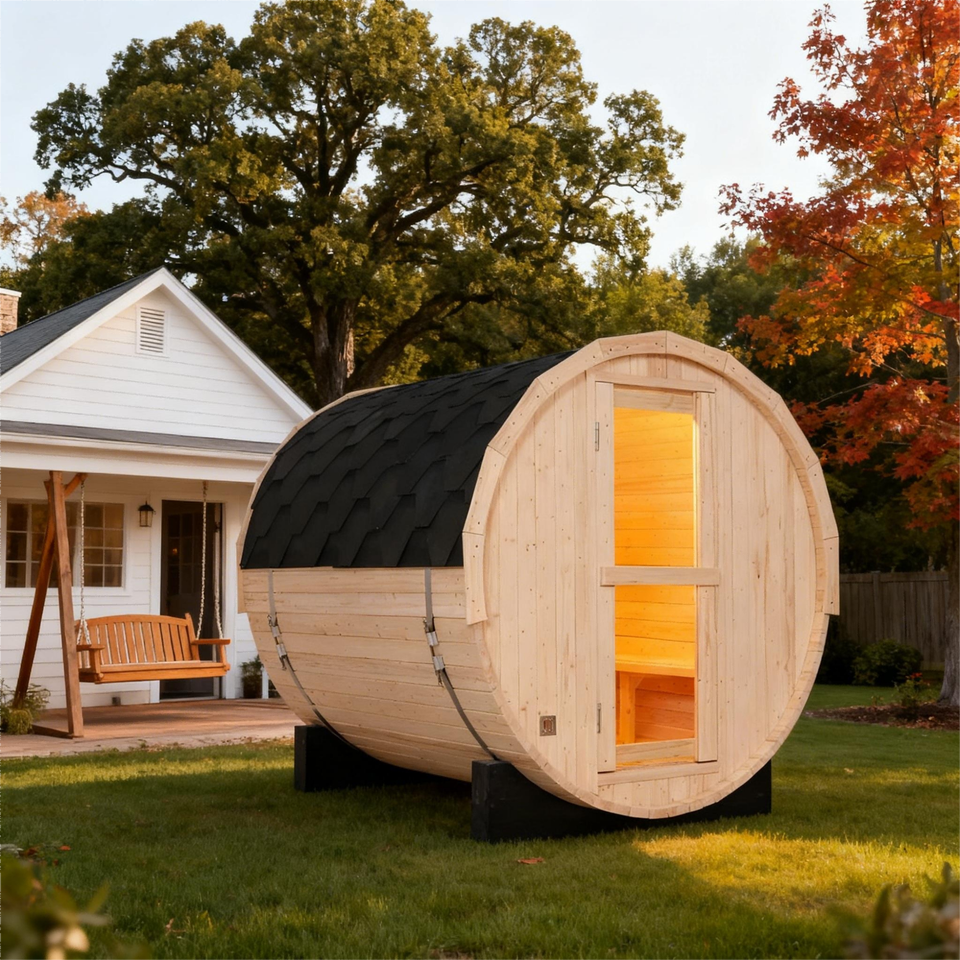 ซาวน่าไม้สนสีขาวกลางแจ้ง สำหรับ 4 คน พร้อมเตา 6 กิโลวัตต์ และกระเบื้องกันฝน
