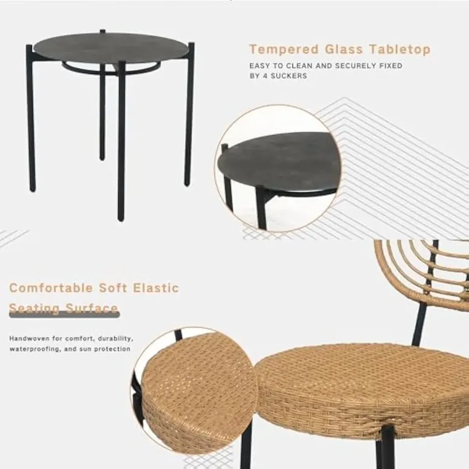 เฟอร์นิเจอร์หวายกลางแจ้ง3ชิ้น, โต๊ะสไตล์บิสโทรลานและเก้าอี้รวมกันหวาย PE ทนต่อสภาพอากาศ