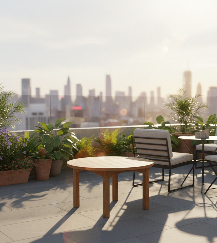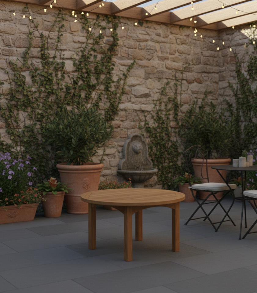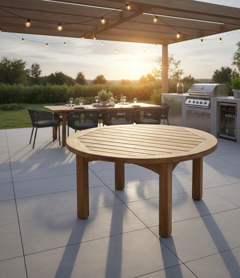 โต๊ะกาแฟทรงกลมพับได้สำหรับใช้งานกลางแจ้ง ผลิตจากไม้สักแท้ ดีไซน์ทันสมัย เหมาะสำหรับพื้นที่รับรองแขกที่สวยงามและทนทาน