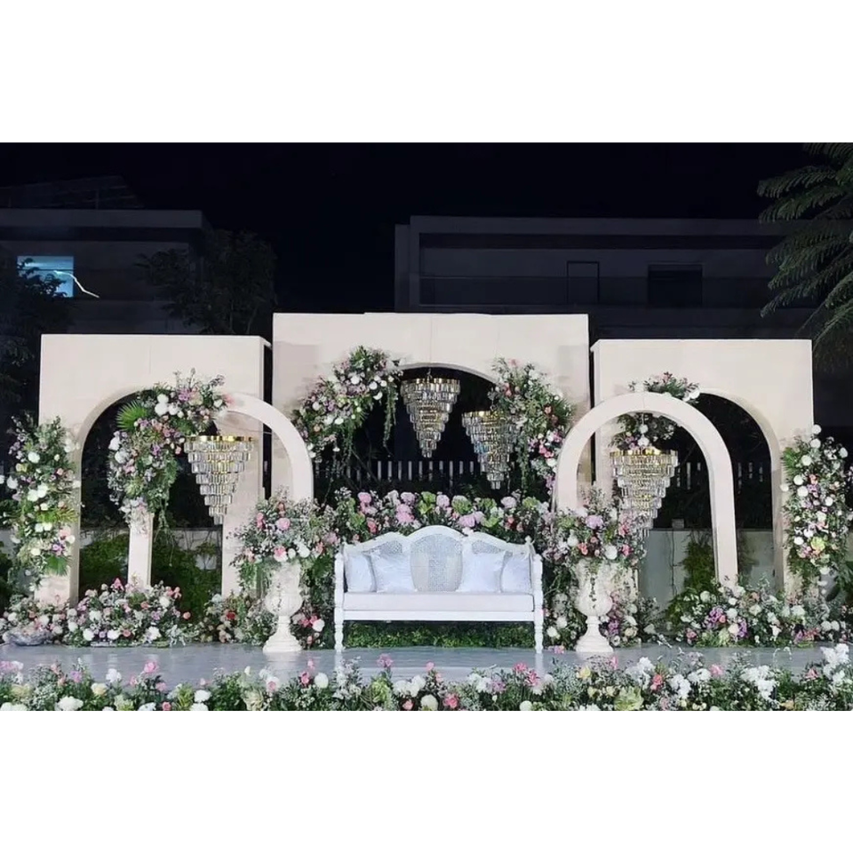 ฉากหลังหรือการตกแต่งเวทีสำหรับพิธีแต่งงานกลางแจ้ง