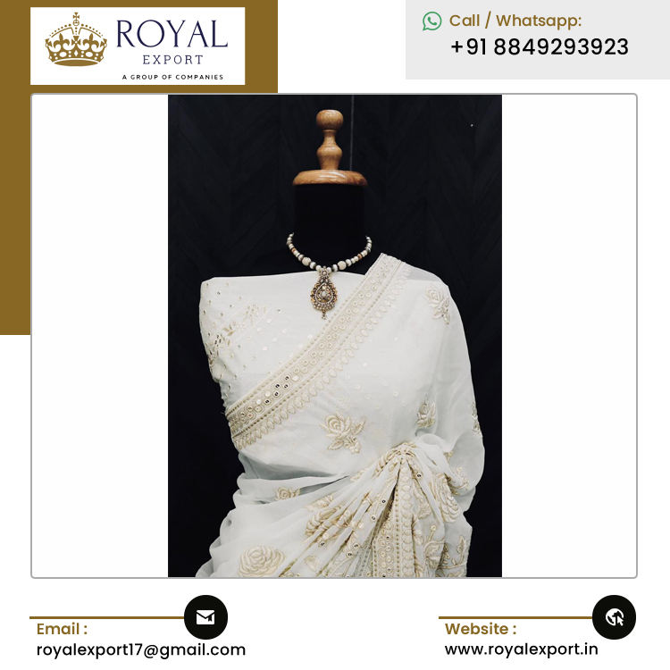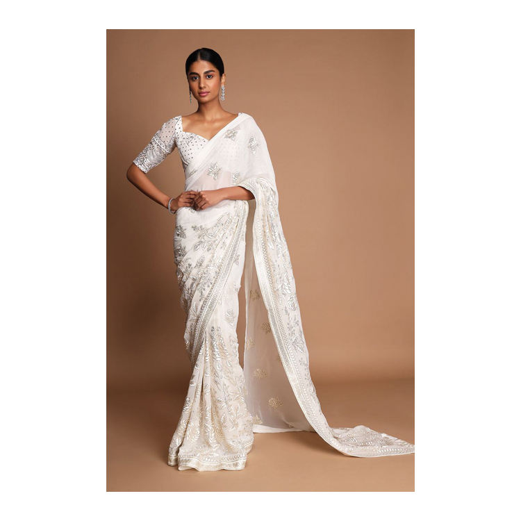 ชุดปาร์ตี้งานแต่งงานแบบอินเดียสีขาวผ้านิ่มผ้าลายทางนิ่มงานปัก