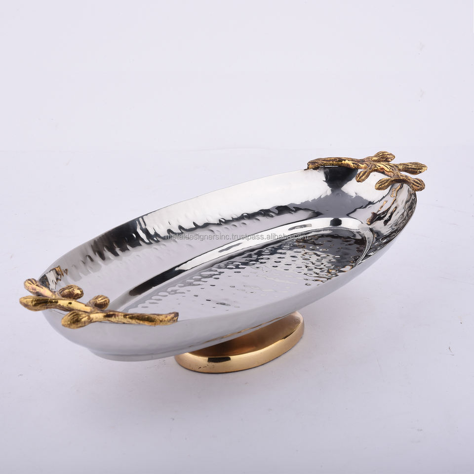 ชามวงรีทำจากสเตนเลสสตีลพร้อมที่จับรูปใบไม้ทองเหลือง,เครื่องใช้บนโต๊ะอาหารเนื้อสัมผัสแบบตอกและเสิร์ฟเครื่องใช้ในครัว