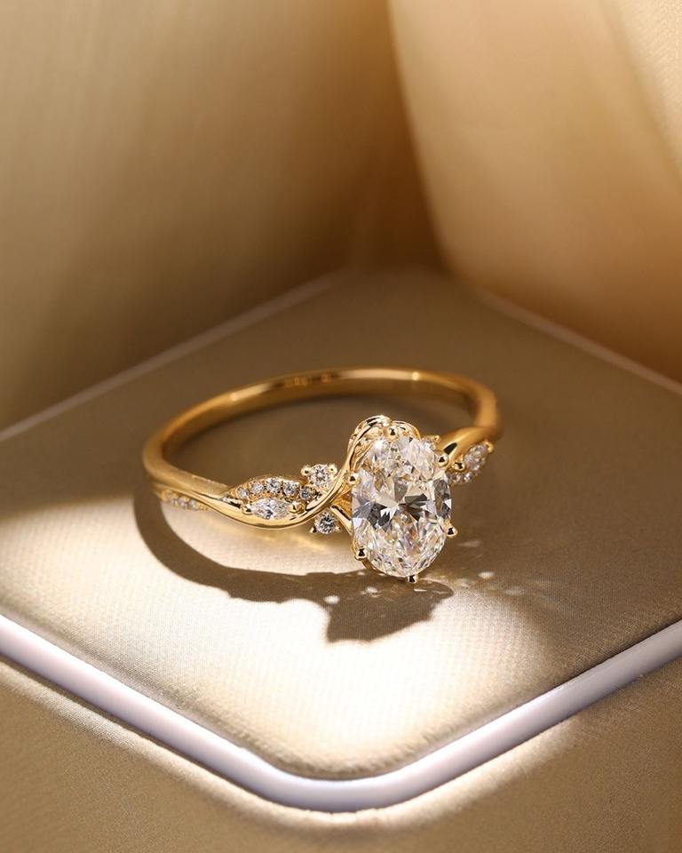 แหวนเพชรทรงรีเจียระไนแบบบริลเลียนท์ เพาะเลี้ยงในห้องปฏิบัติการ ได้รับการรับรองจาก IGI ระยิบระยับ เป็นมิตรต่อสิ่งแวดล้อม เหมาะสำหรับเป็นแหวนหมั้นหรือแหวนครบรอบสำหรับผู้หญิง