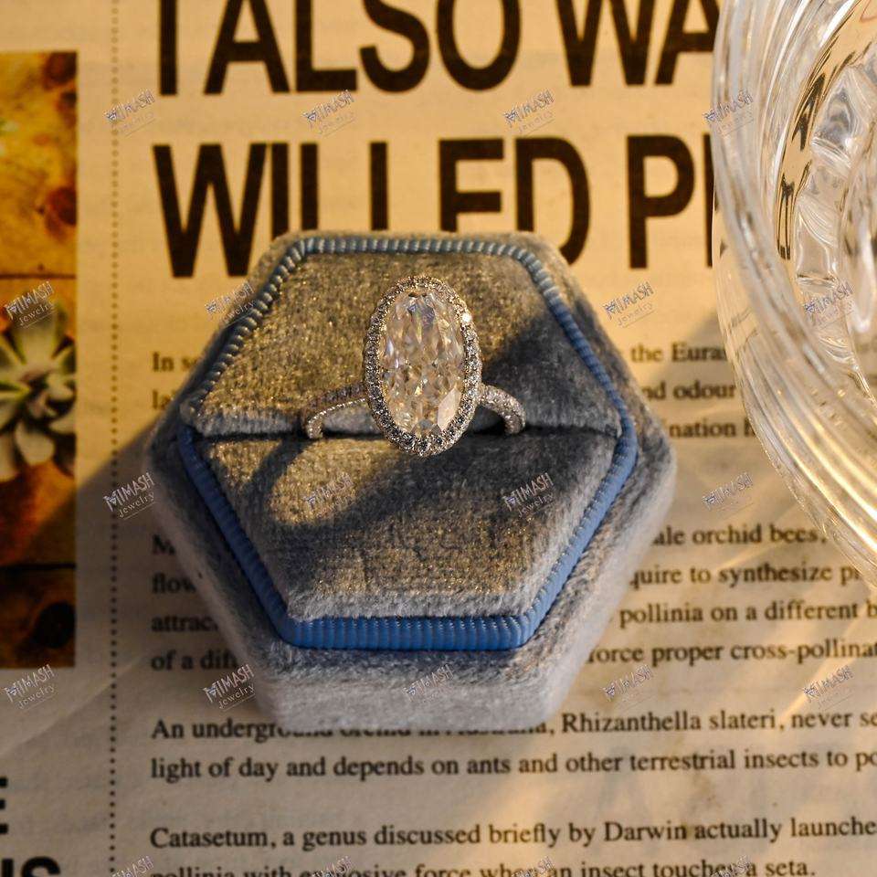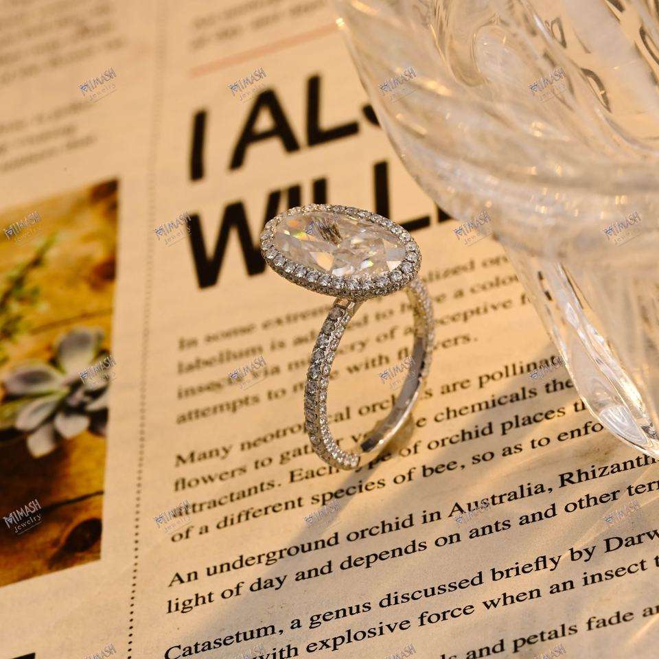 แหวนหมั้นโมอิสซาไนต์ทรงรีเจียระไนแบบน้ำแข็งบด ประดับด้วยวงแหวนทองคำแท้ระยิบระยับสำหรับการขอแต่งงานของเธอ