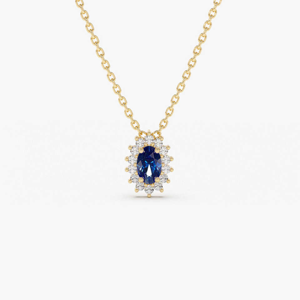 สร้อยคอแซฟไฟร์สีฟ้า0.25ctw รูปไข่สำหรับผู้หญิงโซ่ทองแข็งพร้อมรัศมีเพชรทรงกลม0.10ctw 1.2มม.