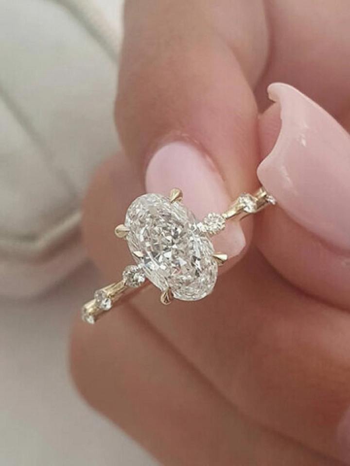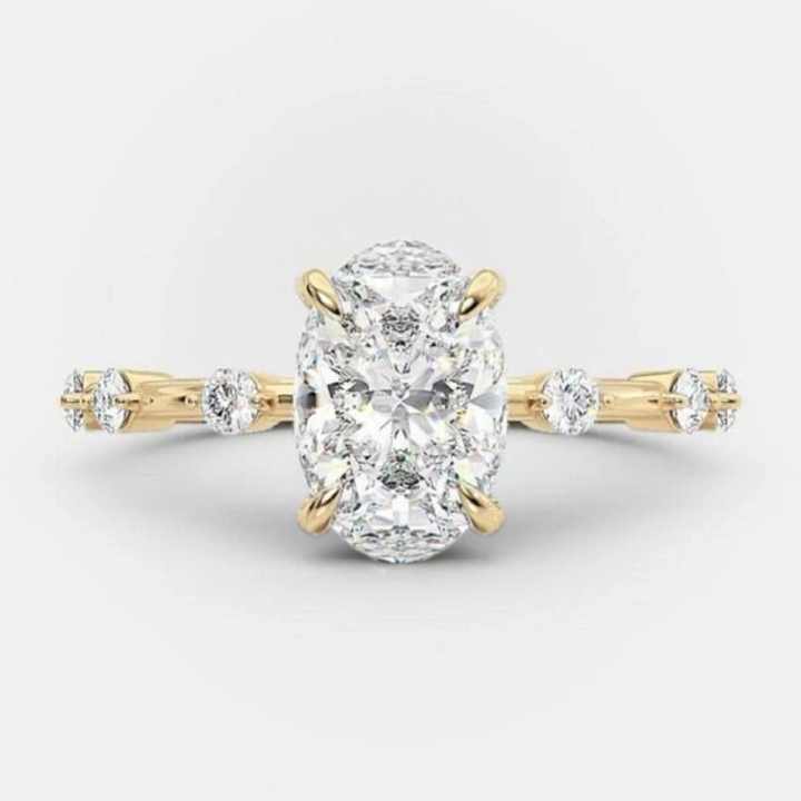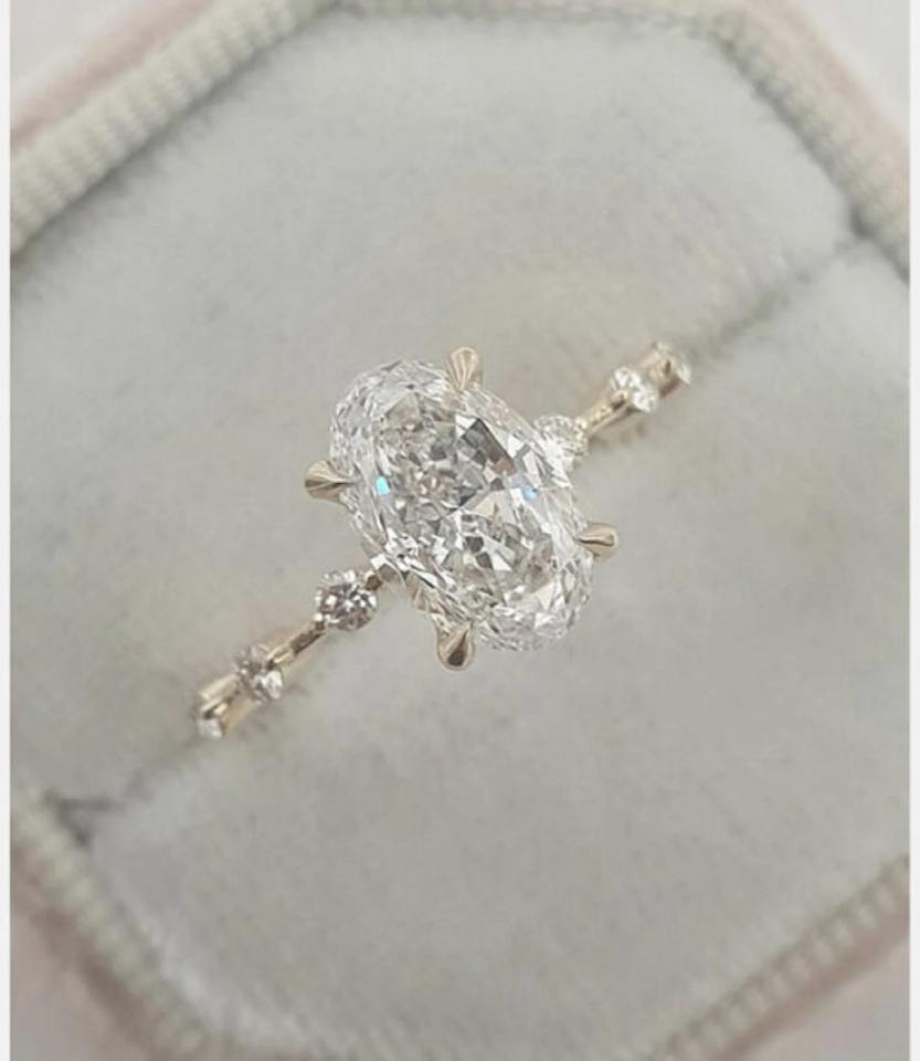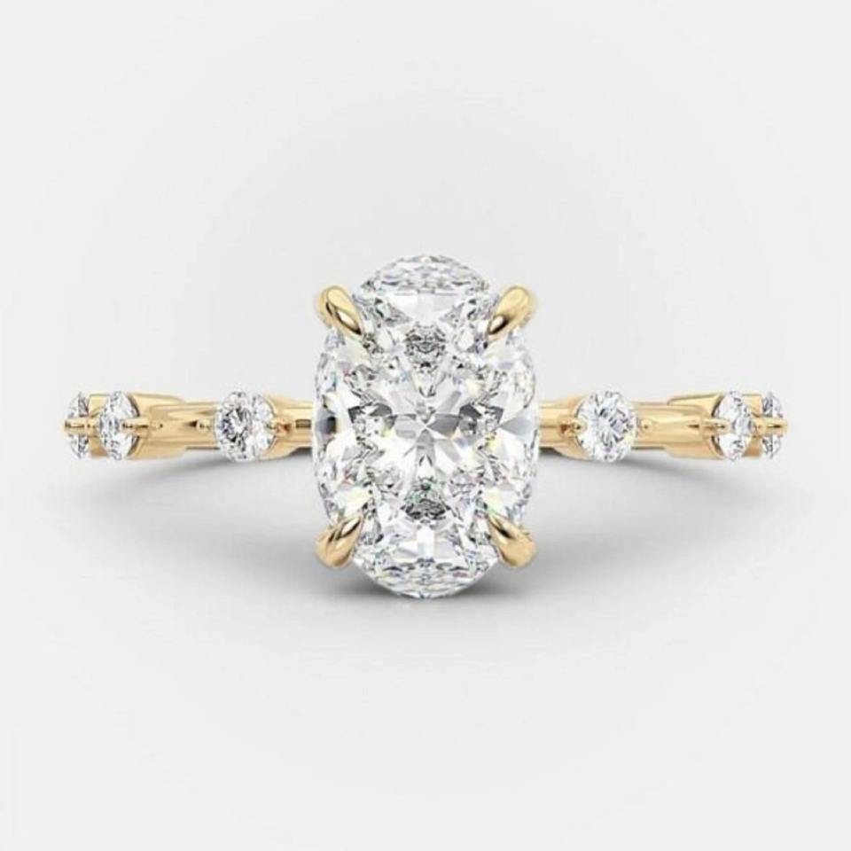 แหวนเพชรทรงรี 1.61 กะรัต เพชรสร้างในห้องปฏิบัติการ ทองคำแท้ 14K สีเหลือง ประดับเพชรเม็ดกลมแบบลอยตัว แหวนหมั้นแบบ 4 กรงเล็บ