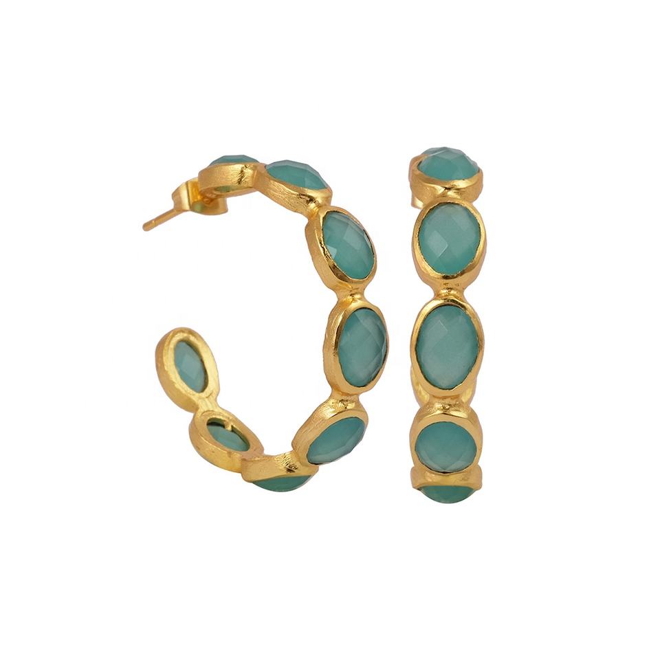 Oval Cut Aqua Chalcedony Gemstone Classic Stud Earrings Collet Setting Brass & Gemstone Jewelry for Party Occasions