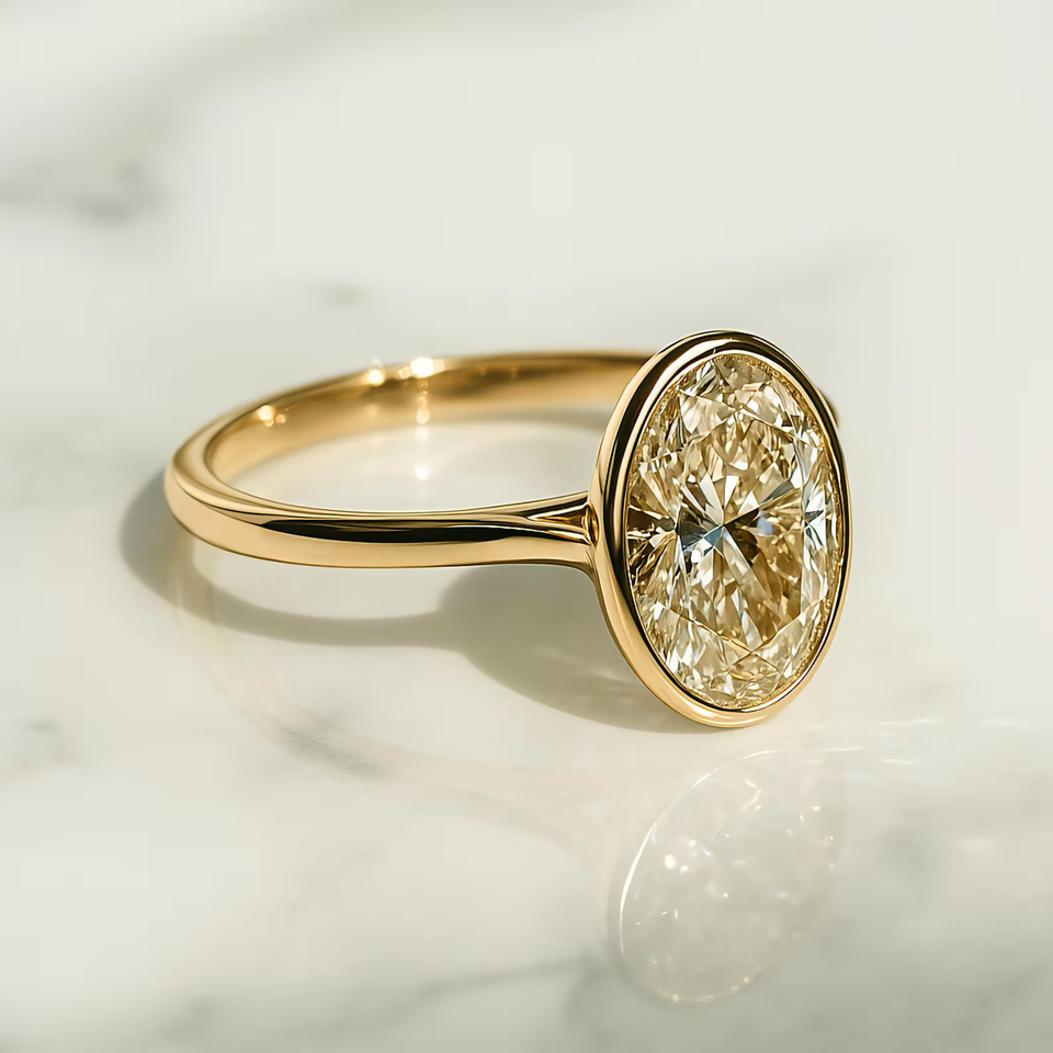 แหวนหมั้นเพชรทรงรีเพาะเลี้ยงในห้องปฏิบัติการ ประดับเพชรทรงลูกแพร์ด้านข้าง ได้รับการรับรองจาก IGI ทองคำแท้ 14K