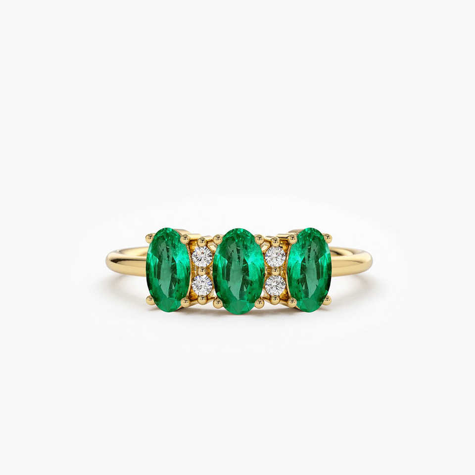 แหวนหมั้นและแต่งงานหรูหรา ประดับเพชรทรงรีสามเม็ดสีเขียวมรกตธรรมชาติ ตัวเรือนทอง 14k พร้อมใบรับรอง งานฝีมือชั้นดี พร้อมส่ง