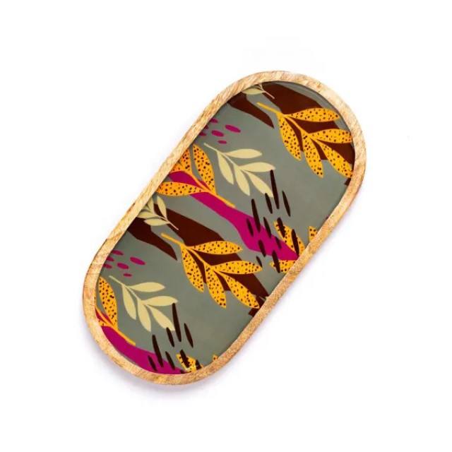 ถาดเสิร์ฟไม้มะม่วงทรงรีถาดไม้ตกแต่งลายใบไม้สีสันสดใสถาดไม้ธรรมชาติทำด้วยมือสำหรับตกแต่งบ้าน