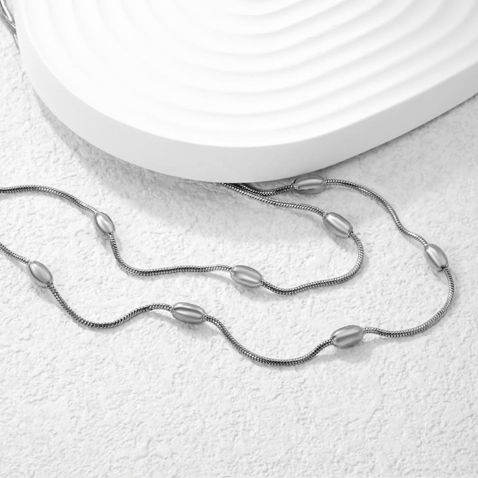 สร้อยคอสามชั้นประดับลูกปัดรูปไข่สีเขียวมะกอก ชุบทอง 18K สร้อยสแตนเลสสตีล เครื่องประดับเรียบหรูทันสมัย สร้อยคอทรงเรขาคณิต
