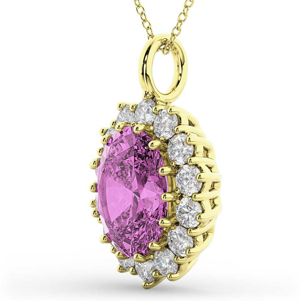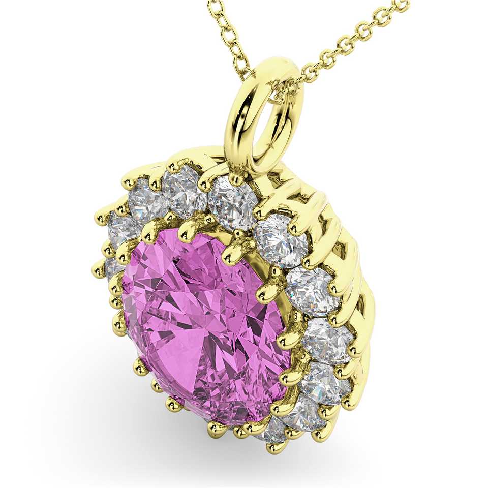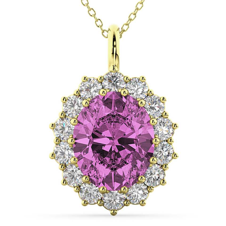 จี้สร้อยคอทรงวงรีประดับพลอยไพลินสีชมพูและเพชรทรงรัศมี ทองคำ 14k สีเหลืองและสีโรสโกลด์ สไตล์ศาสนา ได้รับการรับรองจาก GIA (6.40 กะรัต)