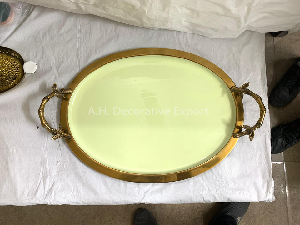 Oval Shape Metal Enamel Tray with Leaf Handles for Hotels and Restaurant Use Breakfast Serving Tray Chocolate Tray