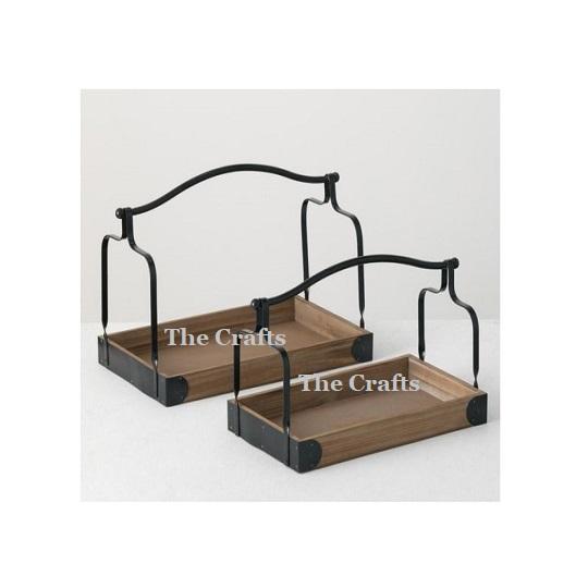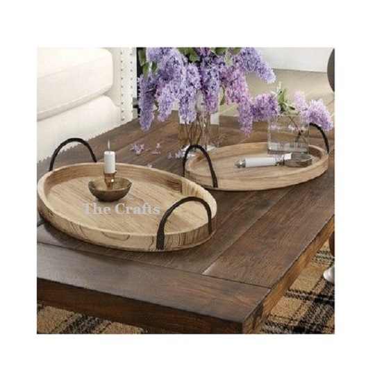 ถาดเสิร์ฟทำจากไม้ทรงรีพร้อมที่จับเหล็กถาดสำหรับใส่ชาและช็อคโกแลตชุดละสองชิ้น