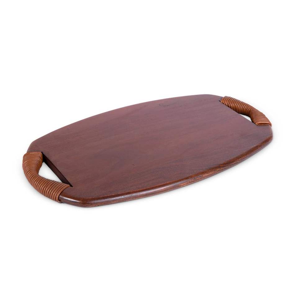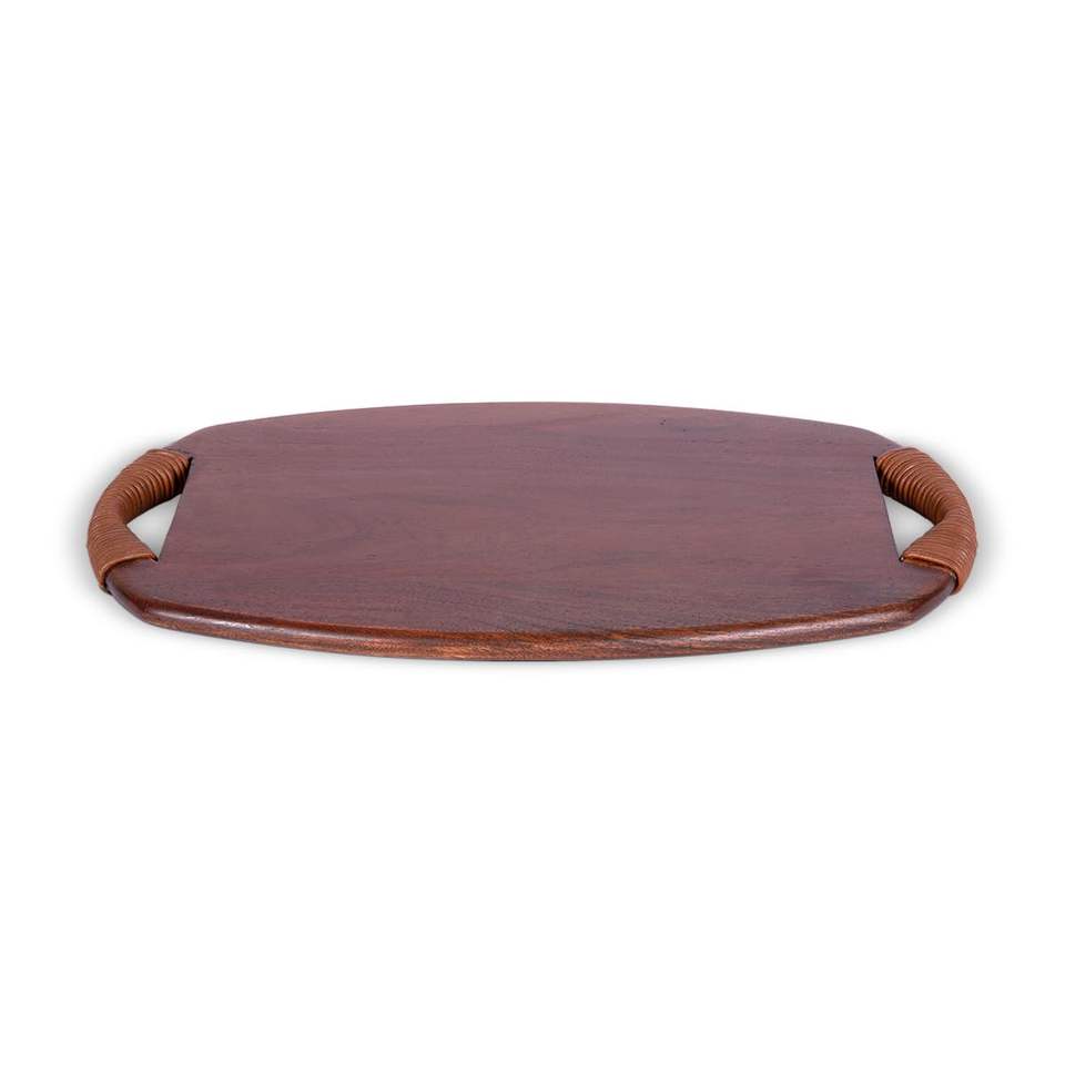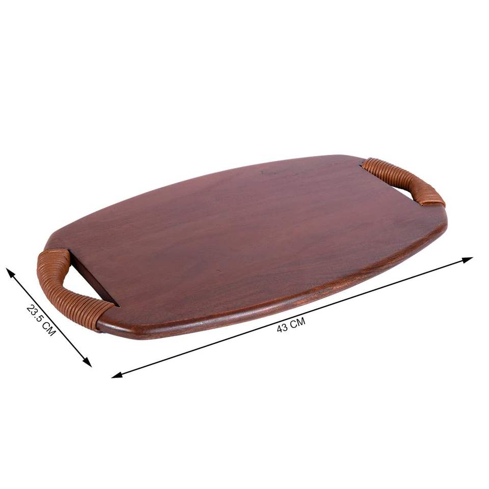 ถาดเสิร์ฟไม้ทรงรีสีวอลนัท ทำจากไม้กระถินเทศ พร้อมหูจับหนัง งานแฮนด์เมด ราคาพิเศษสำหรับลูกค้าสั่งซื้อจำนวนมาก