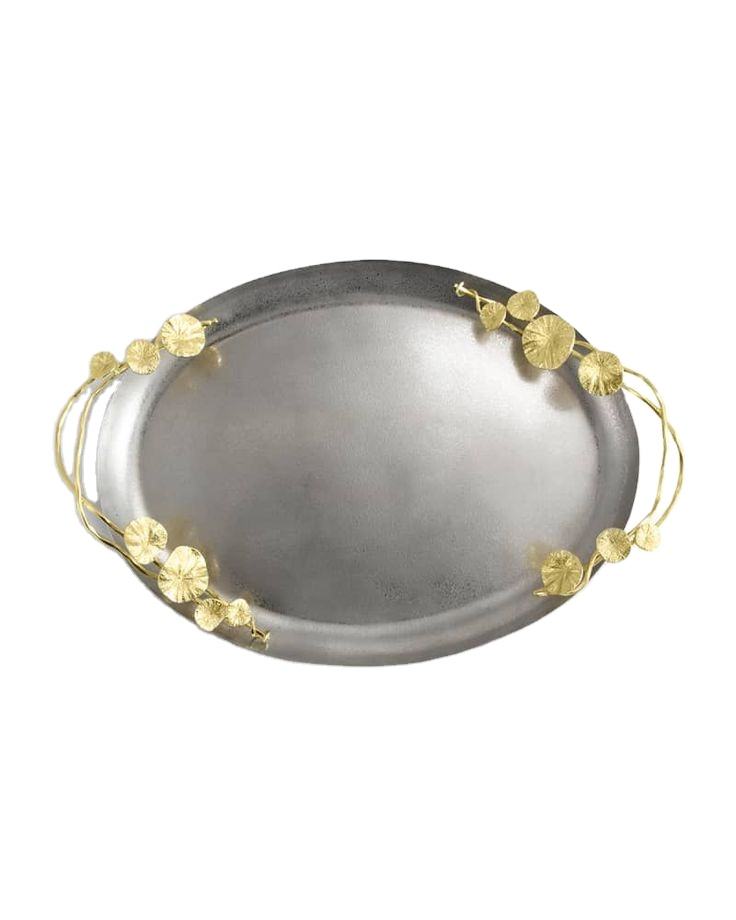 ถาดโลหะสีเงินทรงรีพร้อมที่จับรูปใบไม้สีทองของตกแต่งจานสำหรับจัดงานแต่งงานที่มีสไตล์