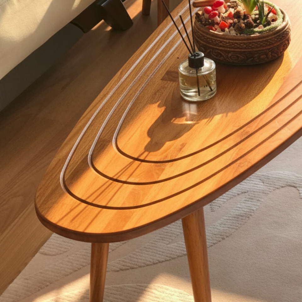 โต๊ะกาแฟทำจากไม้เนื้อแข็งทรงรีมีพื้นผิวเป็นร่องและขาเรียวสไตล์โมเดิร์นกลางศตวรรษ