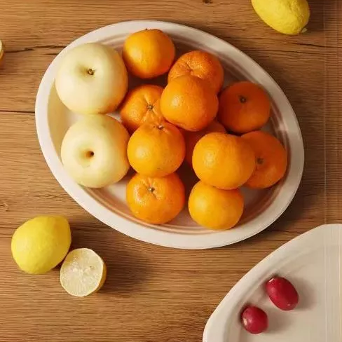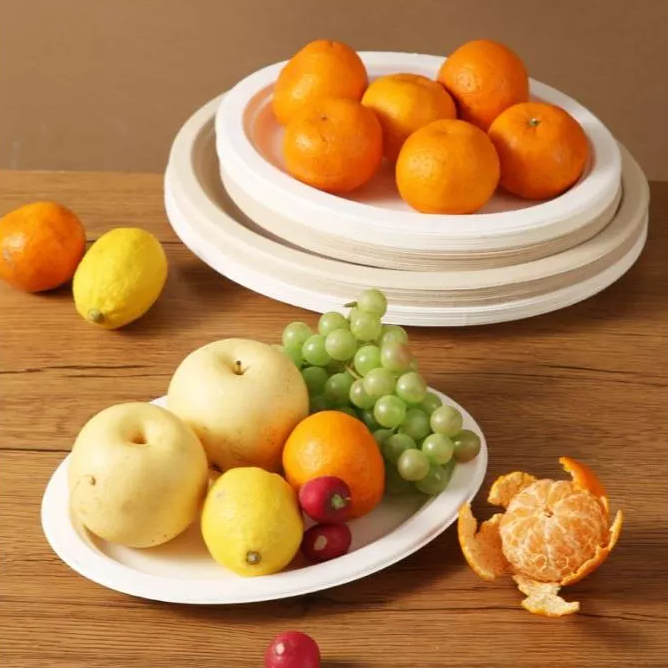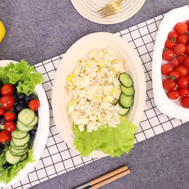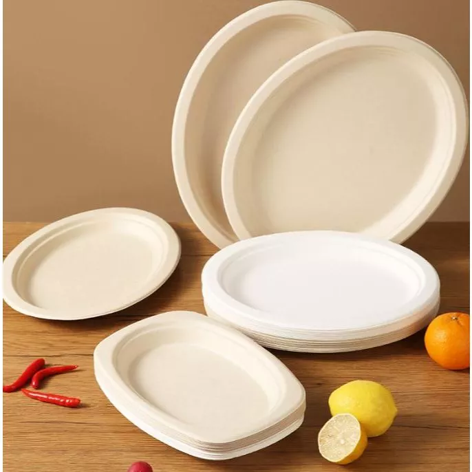 จานชานอ้อยทรงรีเป็นแผ่นแบบใช้แล้วทิ้งที่เป็นมิตรกับสิ่งแวดล้อมจากเวียดนามสำหรับใช้ในงานอีเวนต์และการจัดเลี้ยง