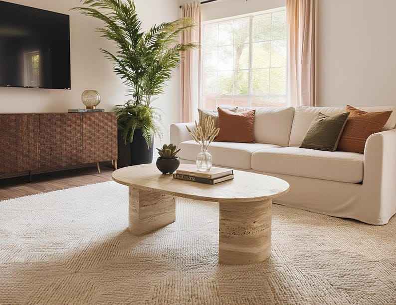 โต๊ะกาแฟทรงวงรีหินอ่อนทราเวอร์ทีน, ฐานหินธรรมชาติเจียรด้วยมือ, เฟอร์นิเจอร์ห้องนั่งเล่นสไตล์เรียบหรู