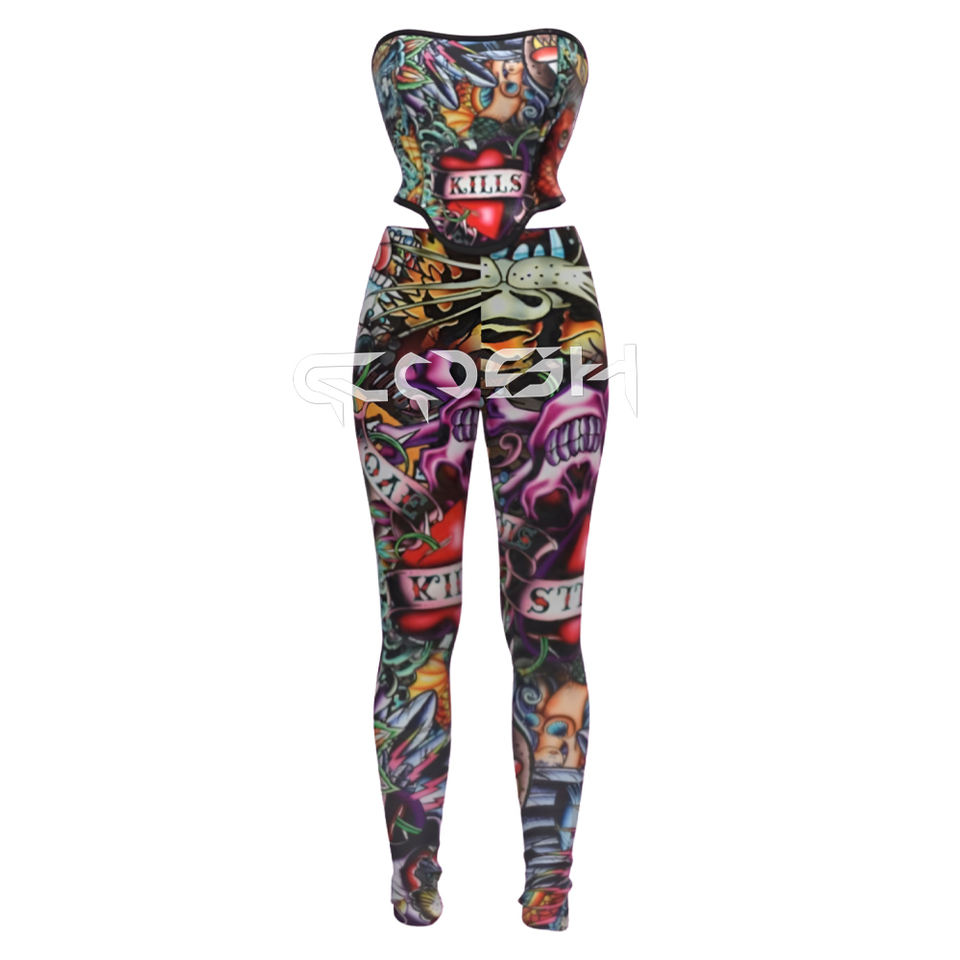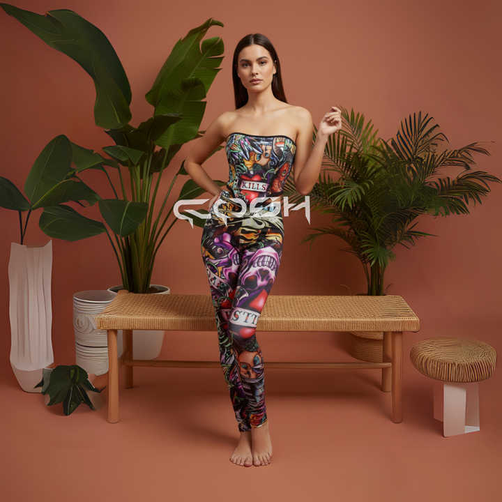 ชุดคอร์เซ็ทผ้าซาตินพิมพ์ลายรักแบบซับลิเมชั่นเสริมโครงเหล็กแบบโอเวอร์บัสท พร้อมกางเกงเลกกิ้งแบบคอมโบ
