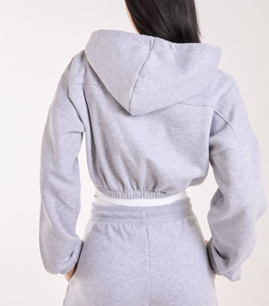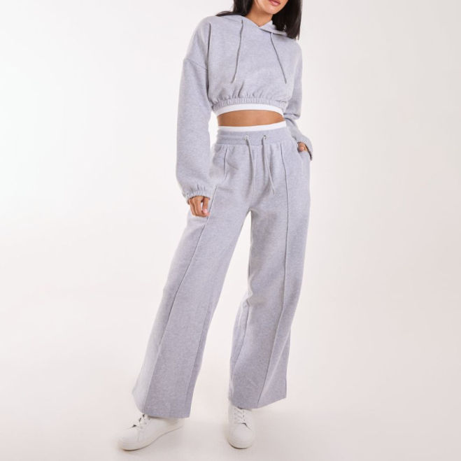 ชุดเซ็ตสตรีทแวร์โอเวอร์ไซส์ เสื้อฮู้ดครอป กางเกงขายาวทรงตรงผ้าเฟรนช์เทอร์รี่ ขอบเอวตัดสีพร้อมเชือกผูก