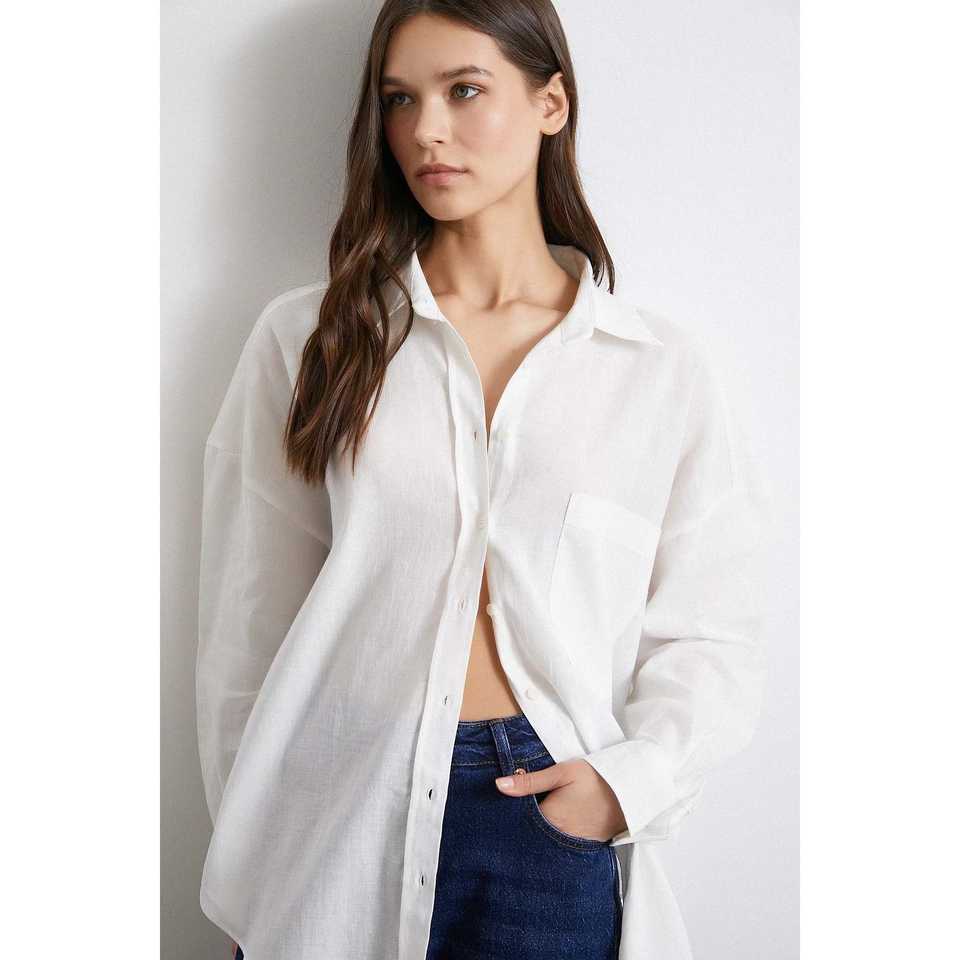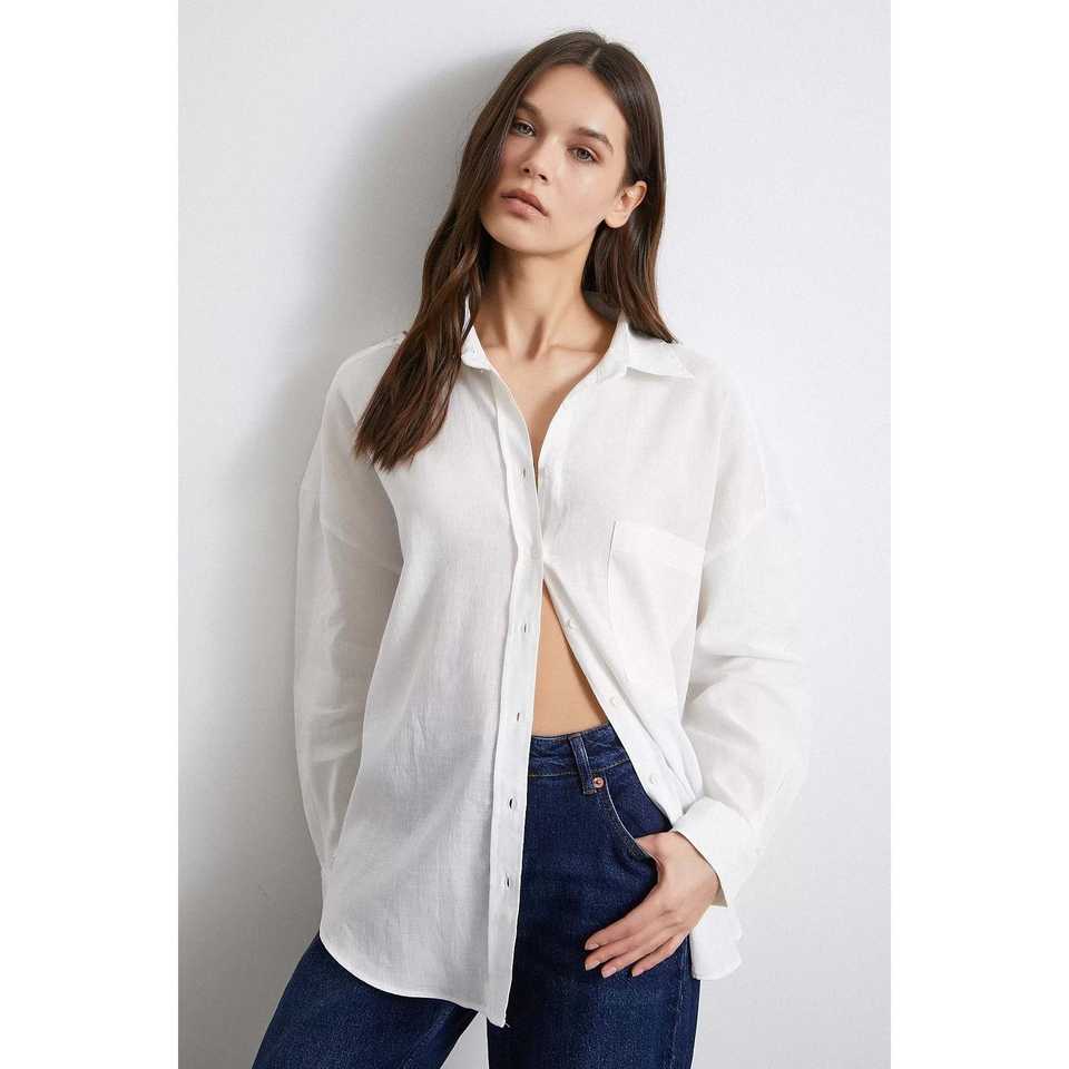 เสื้อเชิ้ตผ้าลินินโอเวอร์ไซส์สำหรับผู้หญิง สีเอครู ติดกระดุม สไตล์มินิมอลสำหรับใส่ทุกวัน