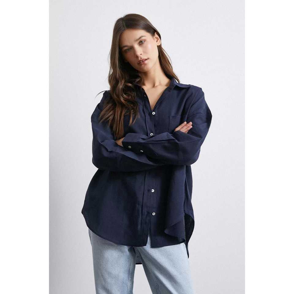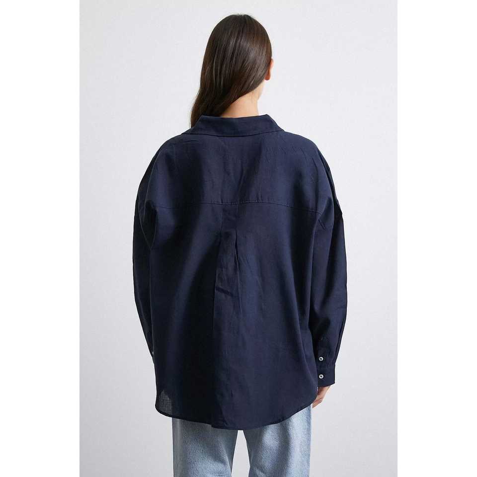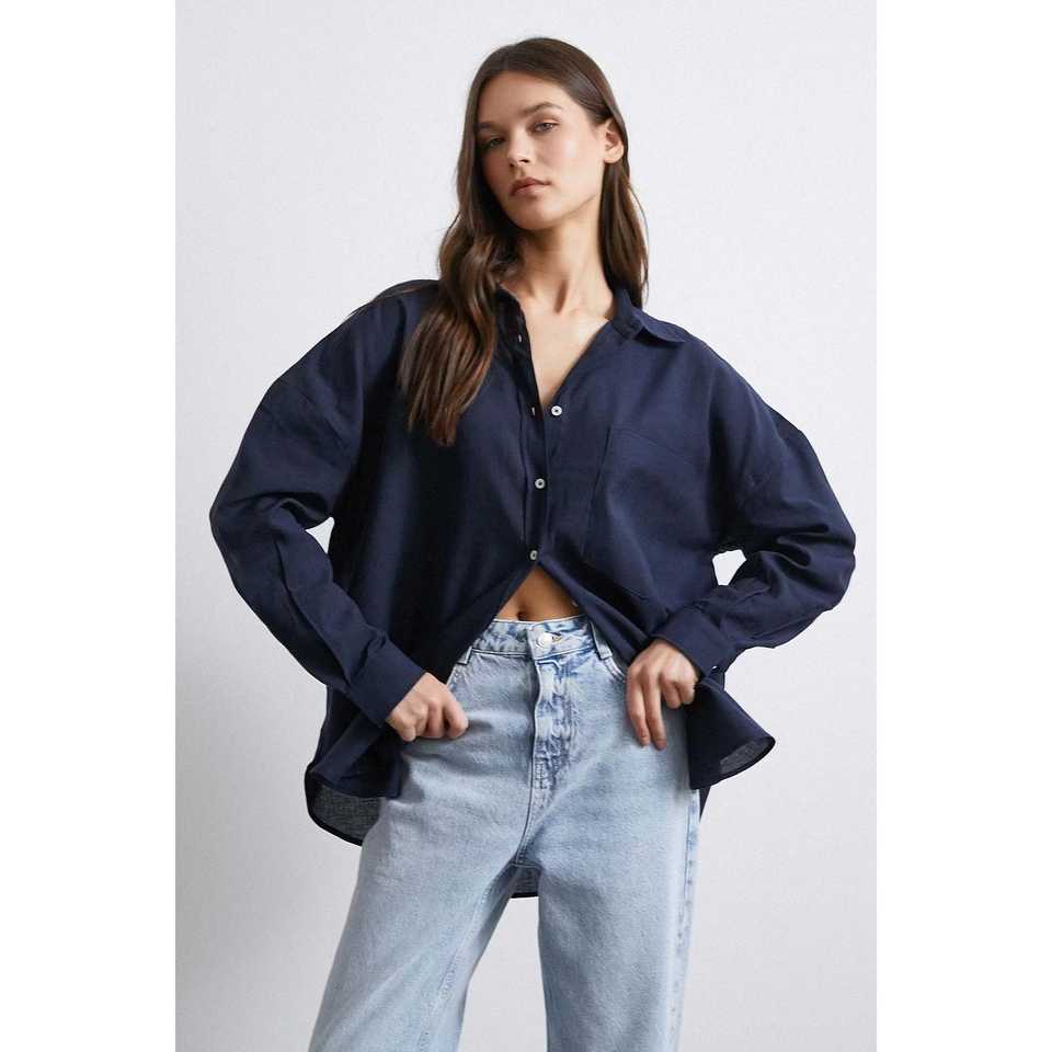 เสื้อเชิ้ตผ้าลินินโอเวอร์ไซส์ผู้หญิง สีกรมท่า สไตล์ลำลอง ติดกระดุม แบบเรียบง่าย ใส่ได้ทุกวัน