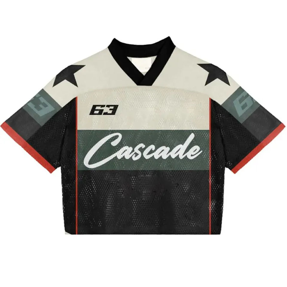 เสื้อเจอร์ซีย์ฟุตบอลคอกลมผ้าโพลีเอสเตอร์100% โอเวอร์ไซส์พิมพ์ลายกราฟิกเสื้อตาข่ายสะพายไหล่สไตล์ฟุตบอล