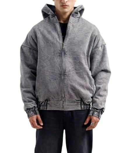 แจ็กเก็ตผ้ายีนส์ฟอกแบบกรดสำหรับผู้หญิงเสื้อแจ็กเก็ตผ้าฝ้ายสีดำล้วนแบบมีซิปสามารถออกแบบโลโก้ได้ตามต้องการ