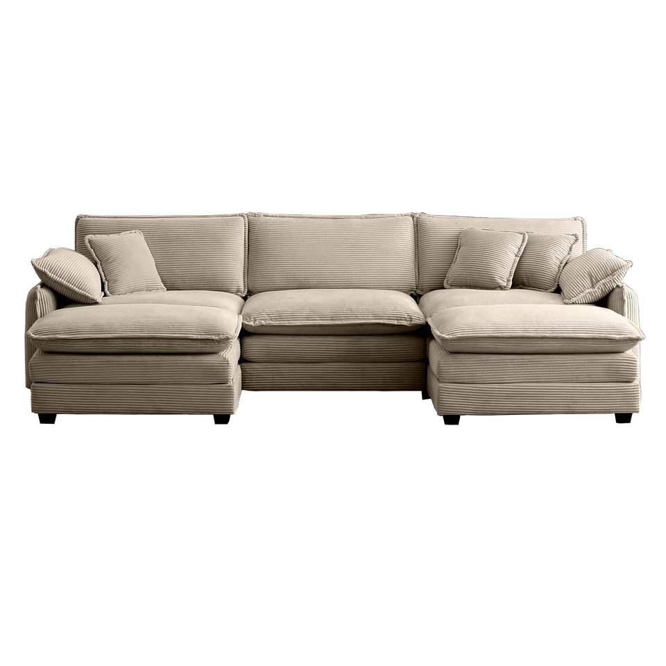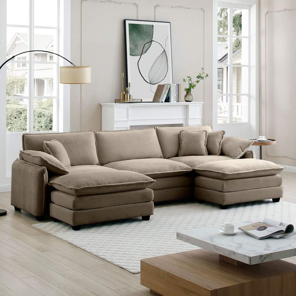 โซฟาผ้ากำมะหยี่ทรงตัวยูขนาดใหญ่ 3 ที่นั่ง พร้อมออตโตมันปรับเปลี่ยนได้ 2 ตัว สำหรับห้องนั่งเล่น