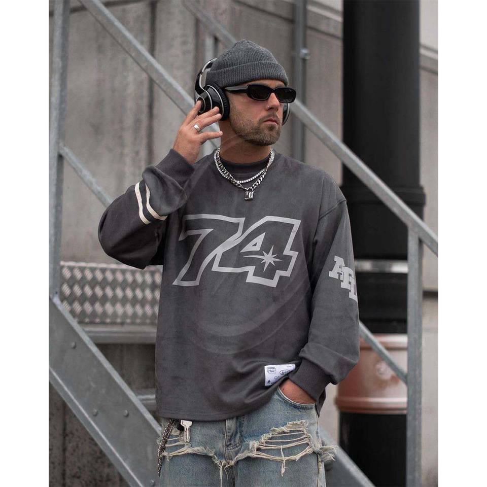 เสื้อสเวตเตอร์คอกลมระบายอากาศสำหรับผู้ชายเสื้อสเวตเตอร์แขนยาวทรงหลวมลายกราฟิกแนวสตรีทไซส์ใหญ่พิเศษ