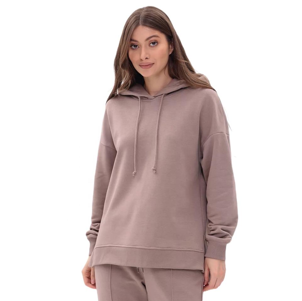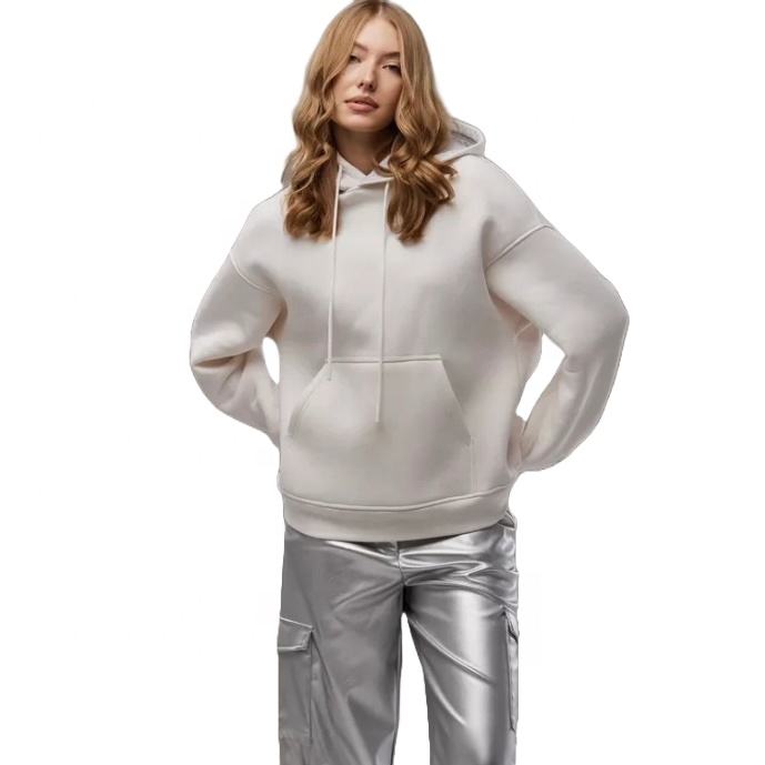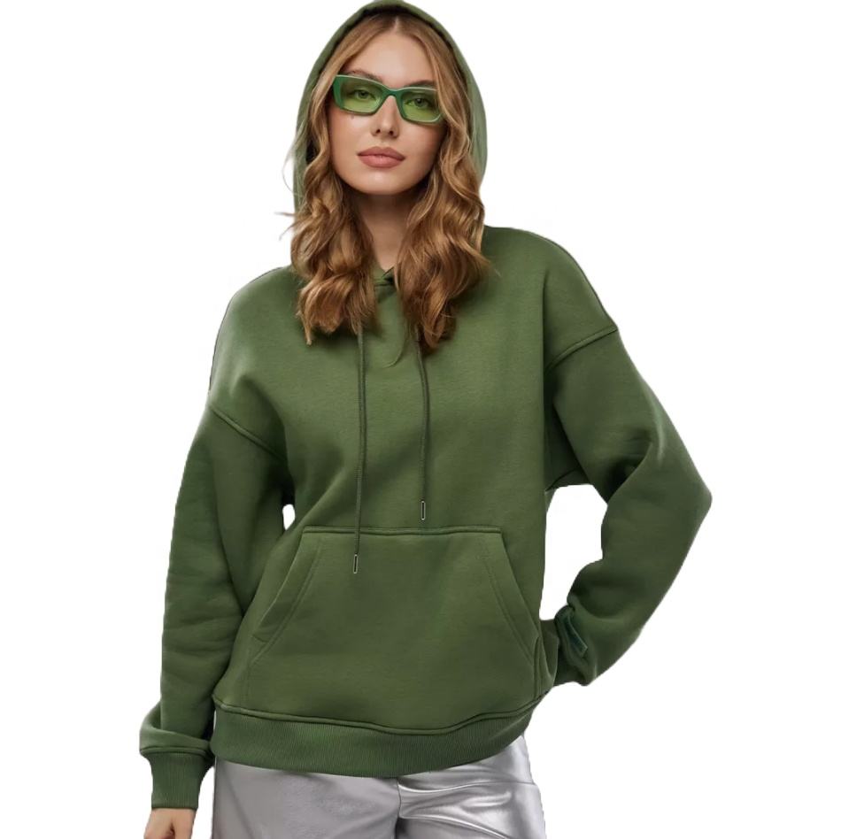 เสื้อฮู้ดสวมหัวไหล่ตกขนาดใหญ่สำหรับผู้หญิงเสื้อฟลีซระบายอากาศได้ดี350gsm โลโก้ที่กำหนดเองพิมพ์ผ้าไหมแบบไม่มีเชือกถัก