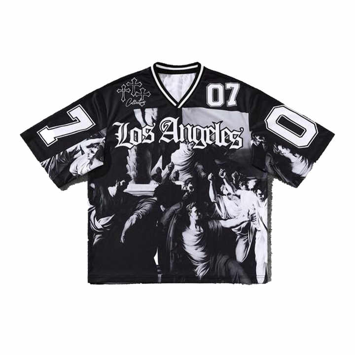 เสื้อเจอร์ซีย์ตาข่ายลายกราฟิกโกธิคขนาดใหญ่ สไตล์สตรีทแวร์ ยูนิเซ็กส์ เสื้อกีฬาฤดูร้อน รับผลิตตามสั่ง ขายส่ง
