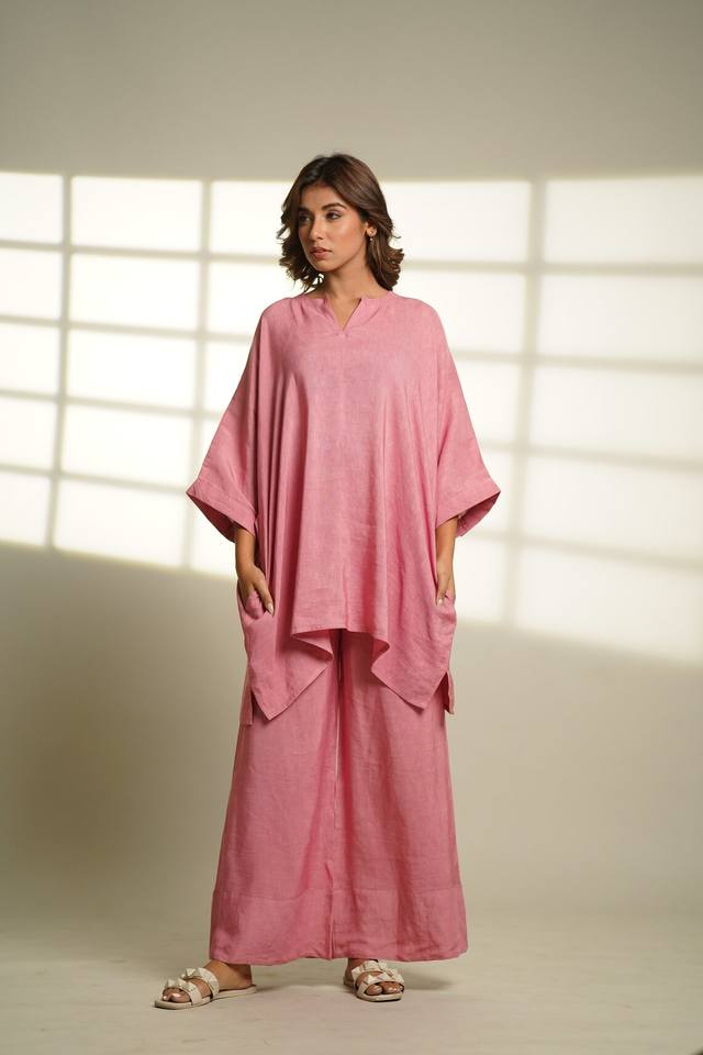 ชุดเสื้อและกางเกงผ้าลินินสองชิ้นสีชมพูขนาดใหญ่ชุดชุดนอนผ้าลินินระบายอากาศใส่สบายออกแบบได้ตามต้องการ