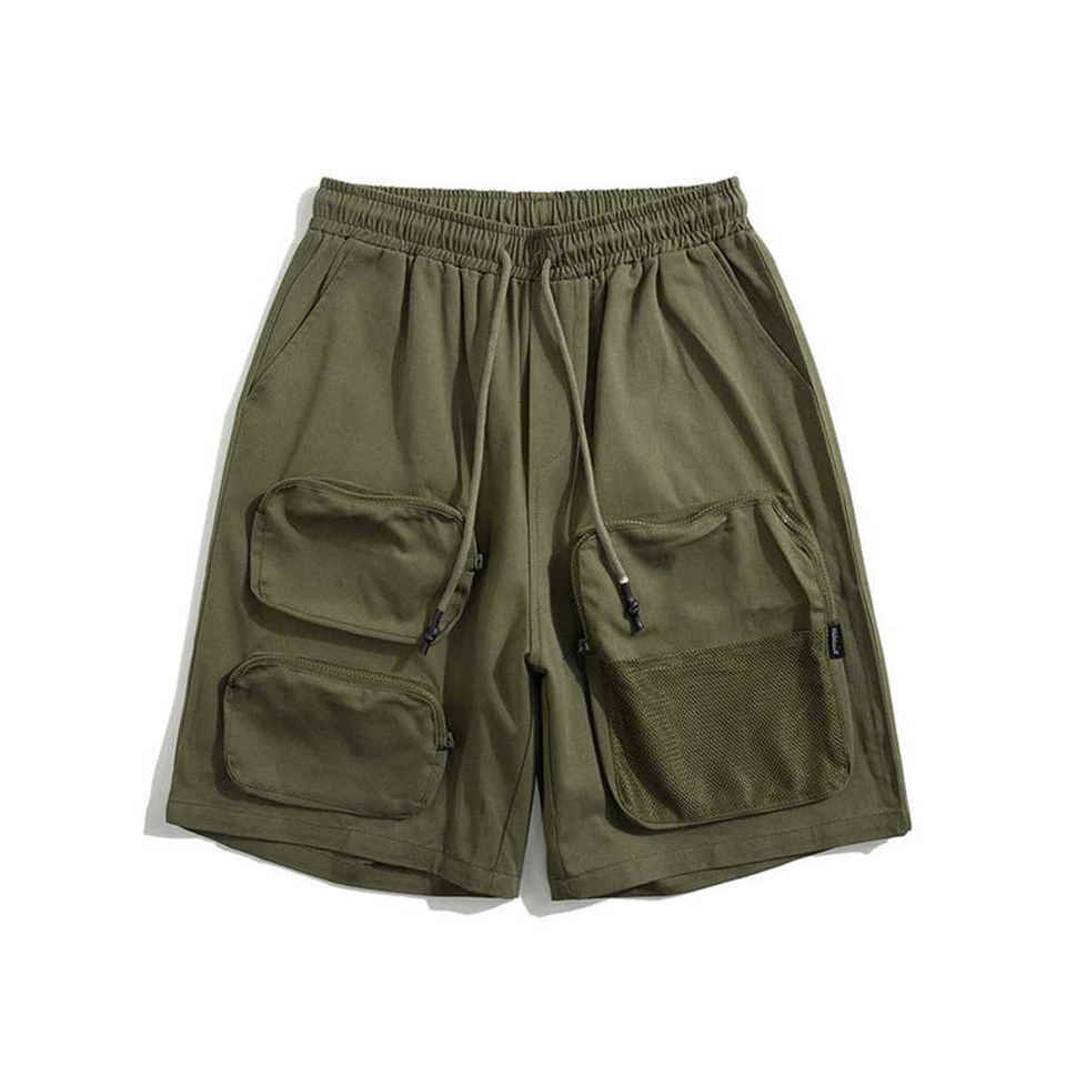 กางเกงขาสั้นคาร์โก้ผู้ชายโอเวอร์ไซส์ติดกระดุมปิดแบบวินเทจผ้าตาข่าย Y2K แนวสตรีทแวร์กระเป๋าสไตล์ลำลอง