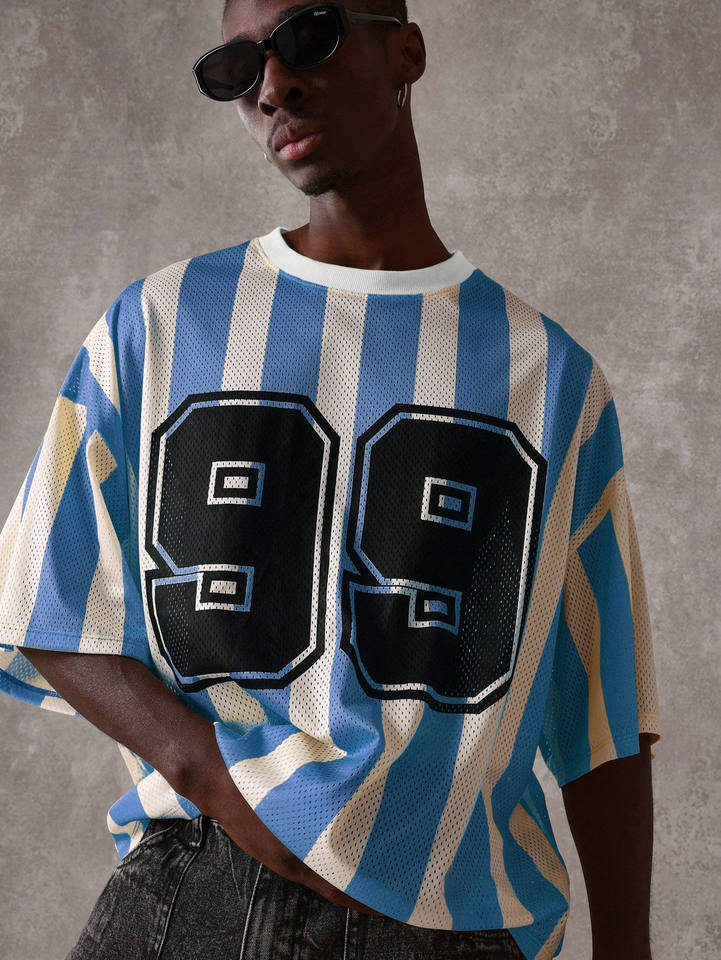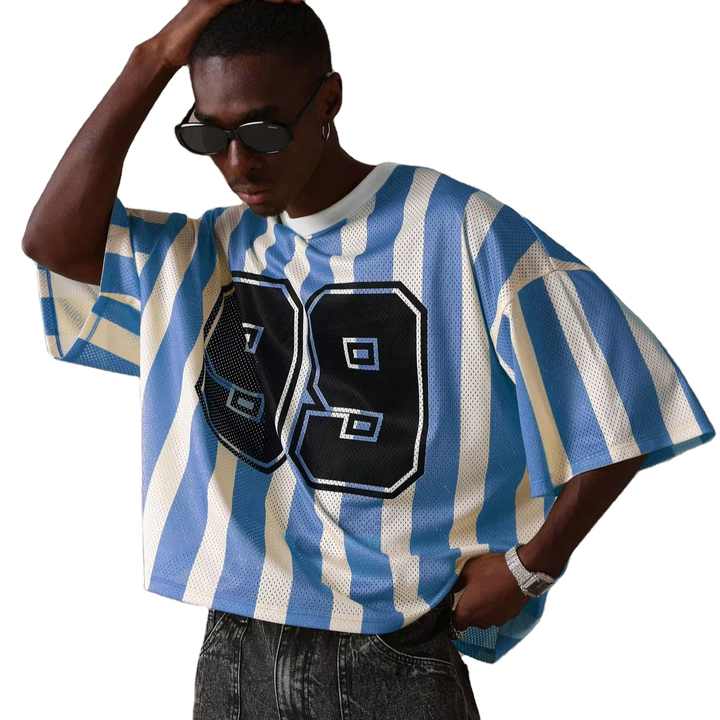 เสื้อฟุตบอลตาข่ายตัวใหญ่ลายทางแนวตั้ง สตรีทแวร์ หมายเลข 99 ลายกราฟิก ระบายอากาศได้ดี โพลีเอสเตอร์ แฟชั่นลำลองสไตล์คนเมือง รับผลิตแบบ OEM