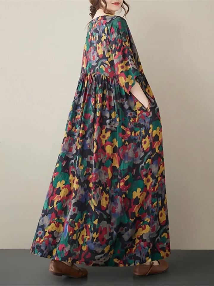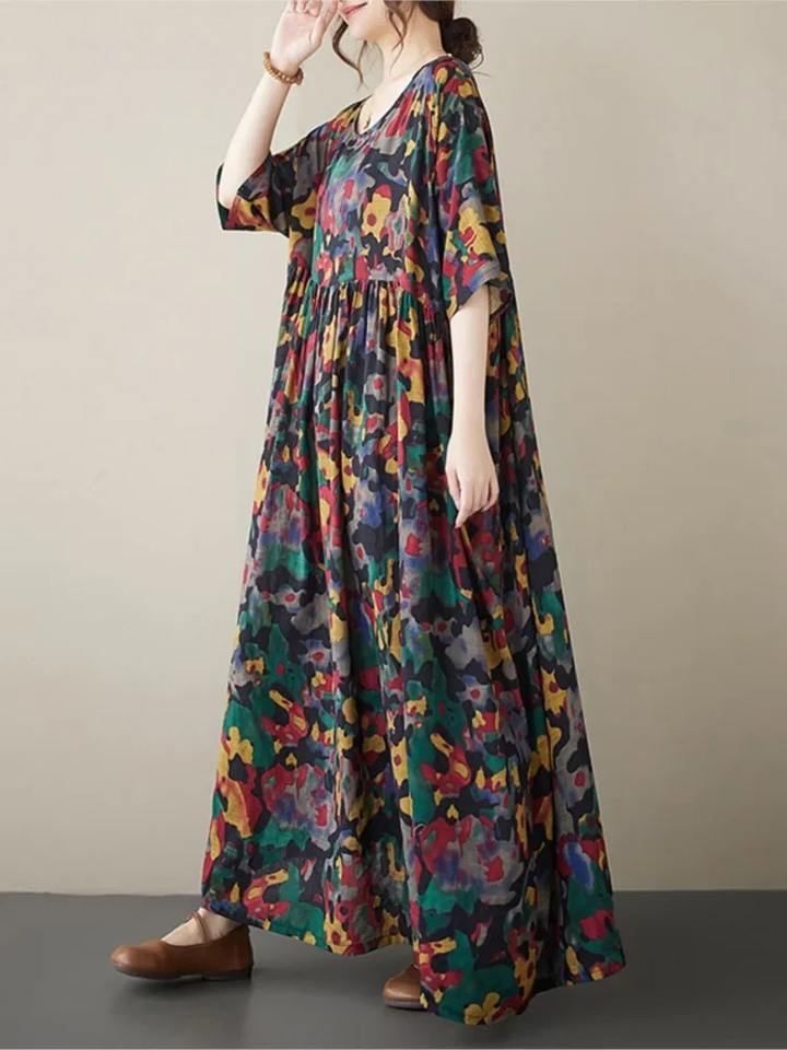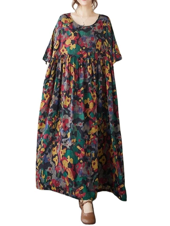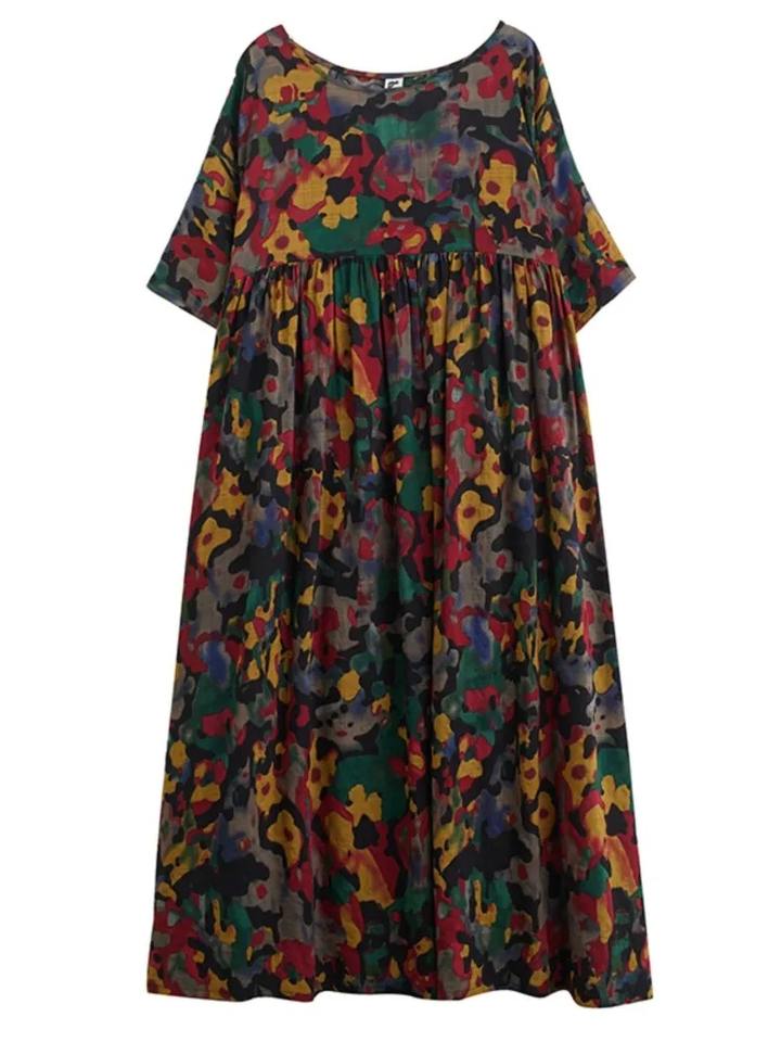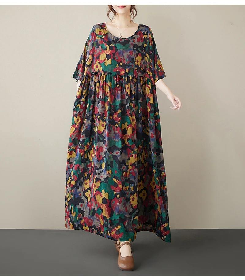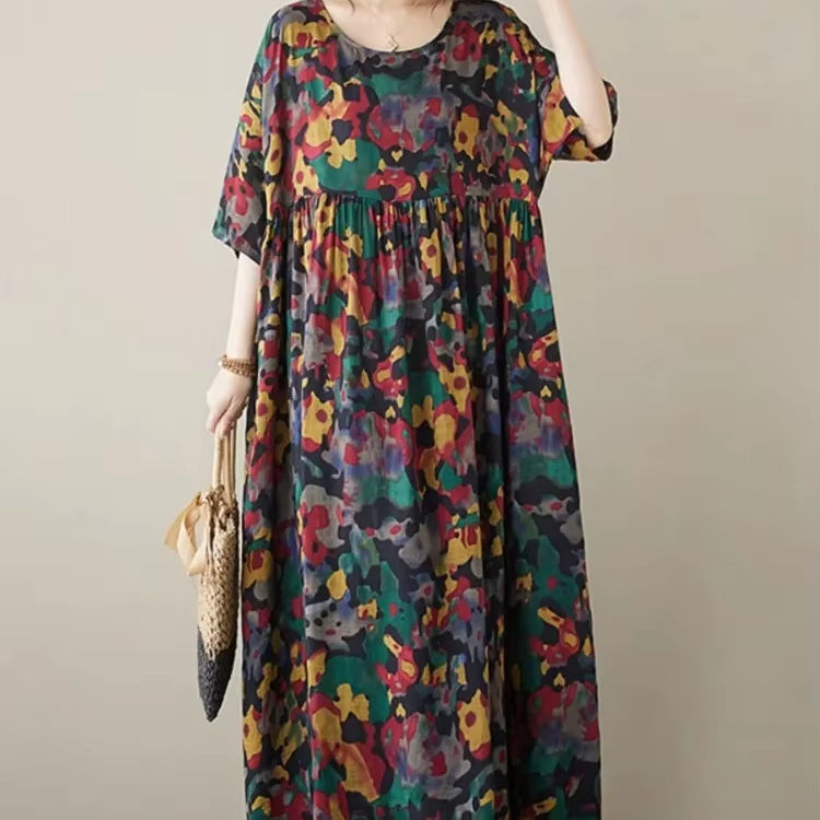 เดรสทรงเอไลน์ยาวโอเวอร์ไซส์สำหรับผู้หญิงผ้าคอตต้อนปัก100% จีบลำลองพิมพ์ลายกราฟฟิตีแบบหลวมฤดูร้อน