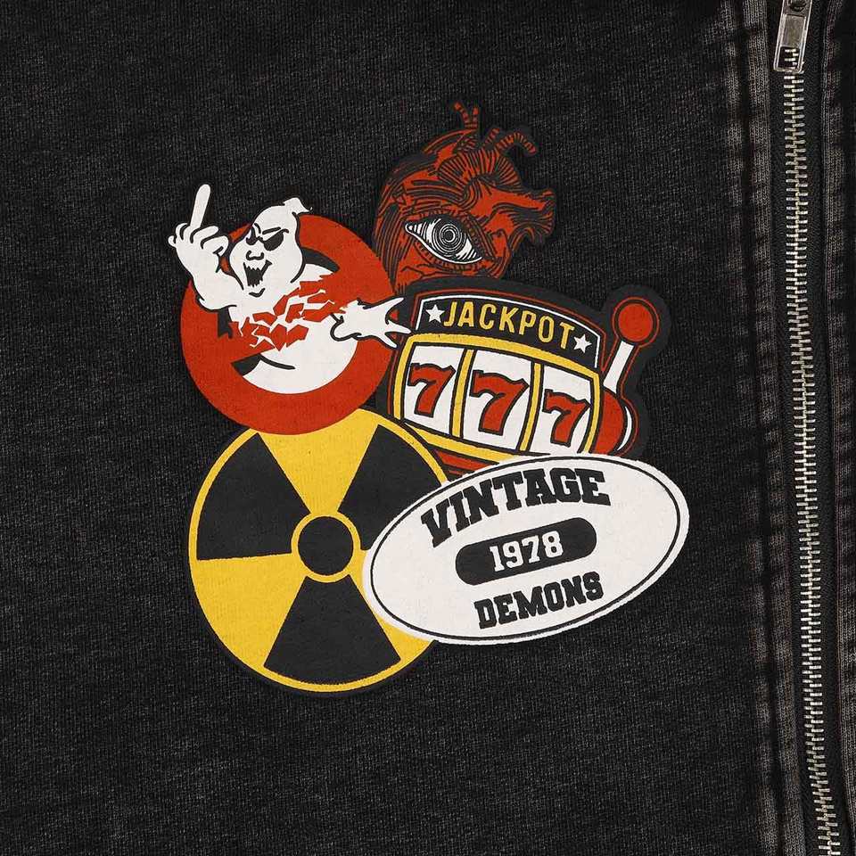 เสื้อมีฮู้ดมีซิปลายกราฟิกอินเทจสีดำเสื้อผ้าแนวสตรีทแวร์พร้อมแขนเสื้อปะติดลายการ์ตูนเสื้อแจ็กเก็ตใช้ได้ทั้งชายและหญิงสำหรับฤดูหนาว
