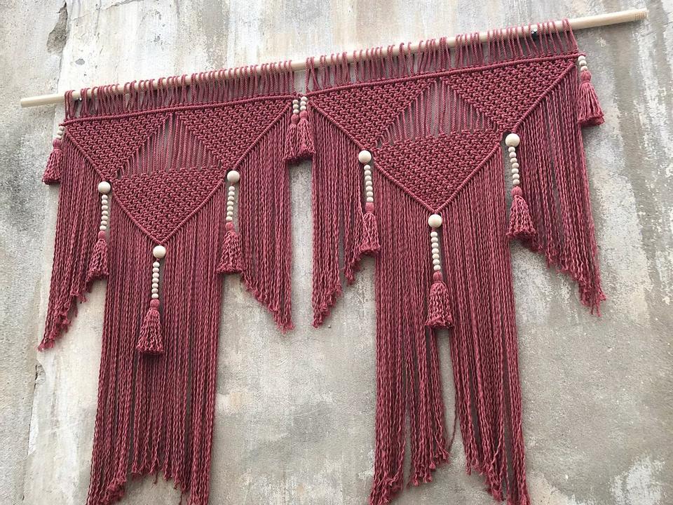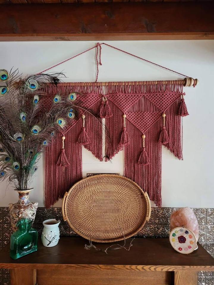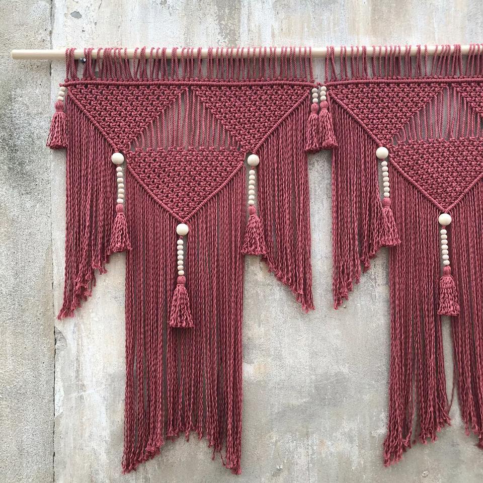 งานถักมาคราเม่สีแดงไวน์ขนาดใหญ่สำหรับตกแต่งผนังหลังโซฟา สร้างบรรยากาศโดดเด่นสะดุดตาในห้องนั่งเล่น