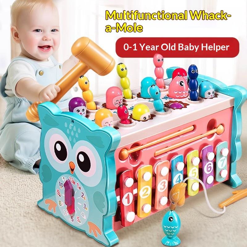 ลูกบาศก์กิจกรรม 6 ด้านรูปนกฮูก ของเล่นเด็กเสริมพัฒนาการ พร้อมเกมตีตัวตุ่น ตกปลา ไซโลโฟน เฟืองหมุน วัสดุ ABS สีชมพู สีเขียว
