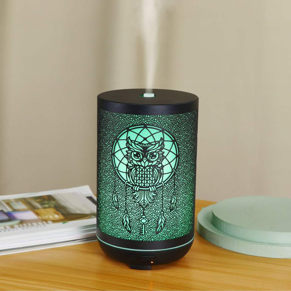 เครื่องกระจายกลิ่นอัลตราโซนิค Owl ขนาด 300 มล. เครื่องเพิ่มความชื้นแบบโลหะขนาดเล็ก พร้อมไฟ LED สำหรับใช้ในบ้านและเชิงพาณิชย์