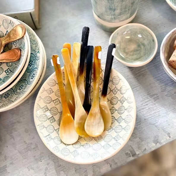 ช้อนทำจากเขาควาย ช้อนขนมหวานทำมือ ด้ามจับทำจากเขาควาย รวมถึงช้อนคนทำจากเขาควาย ขัดเงาสำหรับการปรุงอาหาร