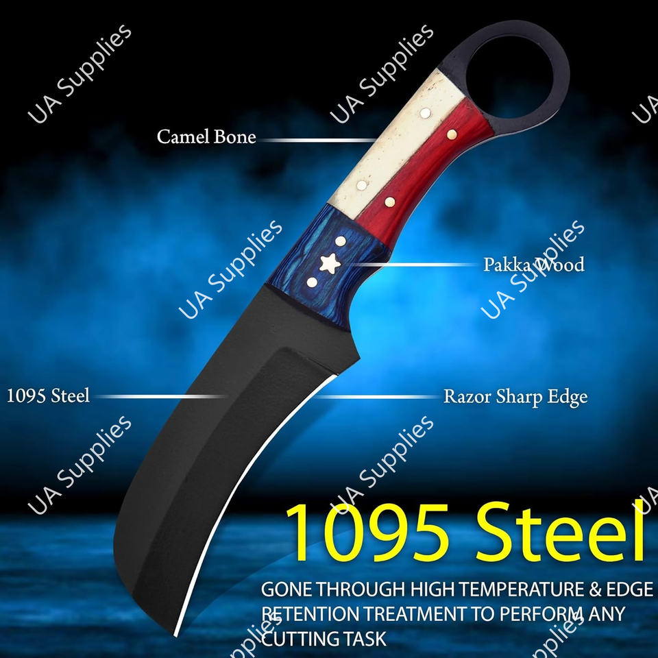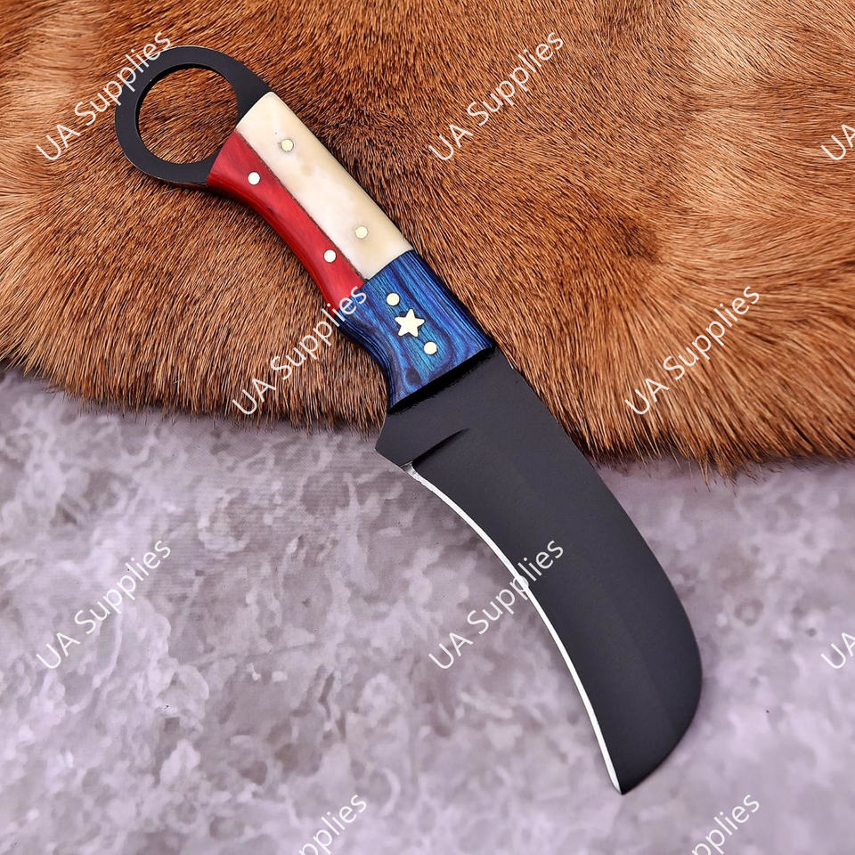 มีดเหล็กกล้าคาร์บอนเคลือบออกไซด์ ปลายแหลม ใบมีดคงที่ มีรูสำหรับนิ้วมือ สำหรับล่าสัตว์ กิจกรรมกลางแจ้ง ใช้แล้วทิ้งได้ ด้ามทำจากกระดูกอูฐและไม้ แนวนอน