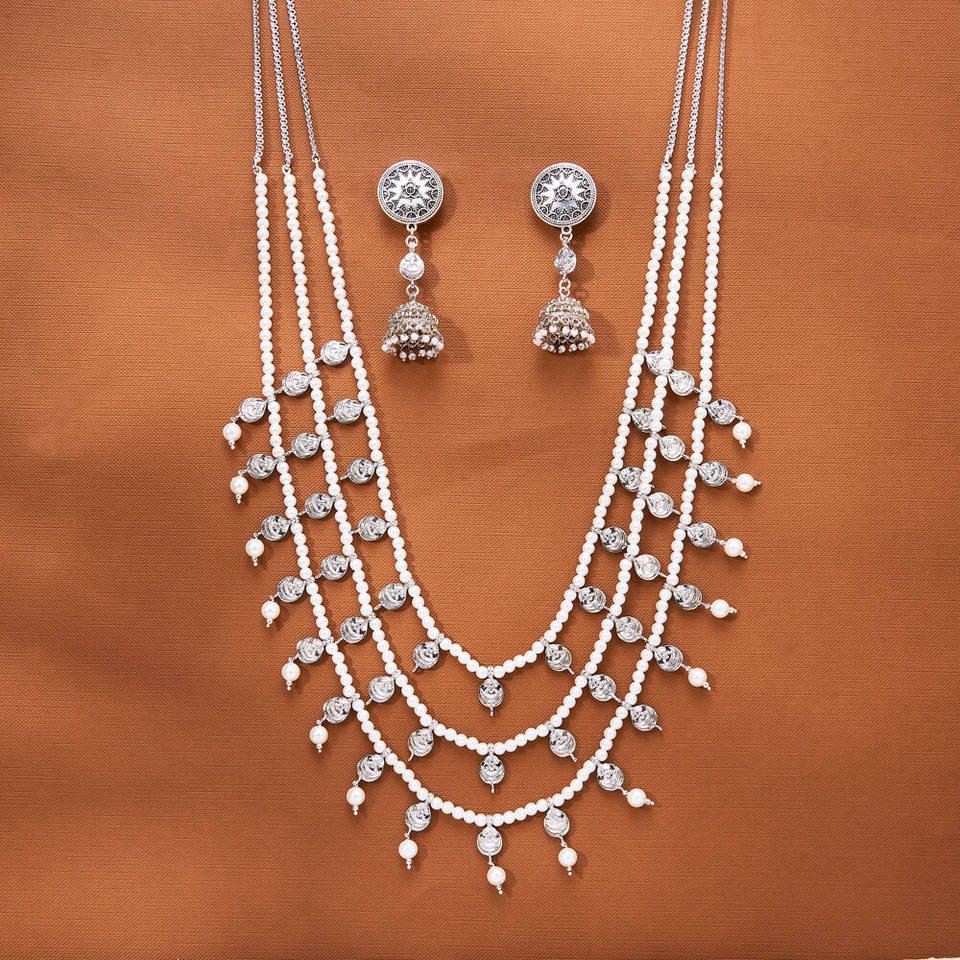 ชุดสร้อยคอแฟชั่นสร้อยคอหลายชั้นเคลือบสารออกซิไดซ์ Mala ส่งออกจากอินเดียพร้อมเครื่องประดับเทียม