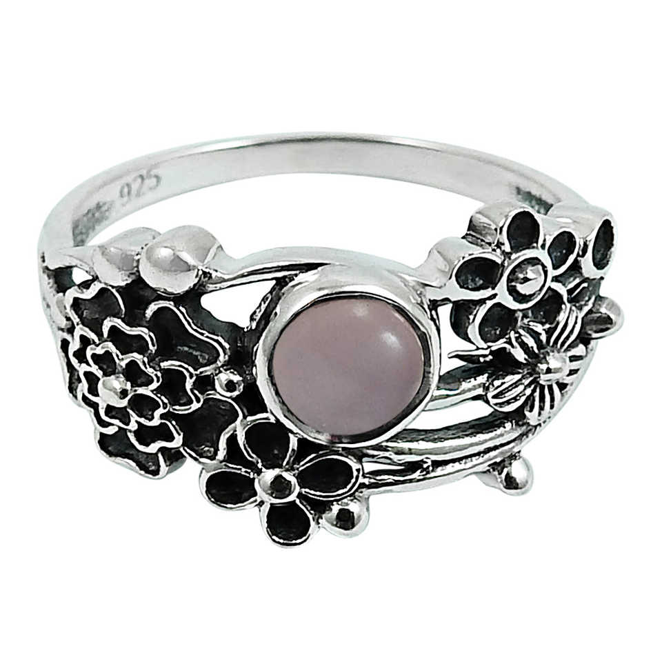 แหวนเงินแท้ 925 ออกซิไดซ์ ดีไซน์ดอกไม้สุดหรู ประดับด้วยพลอยโรสควอตซ์ทรงกลม เครื่องประดับสไตล์โบโฮสำหรับผู้หญิง