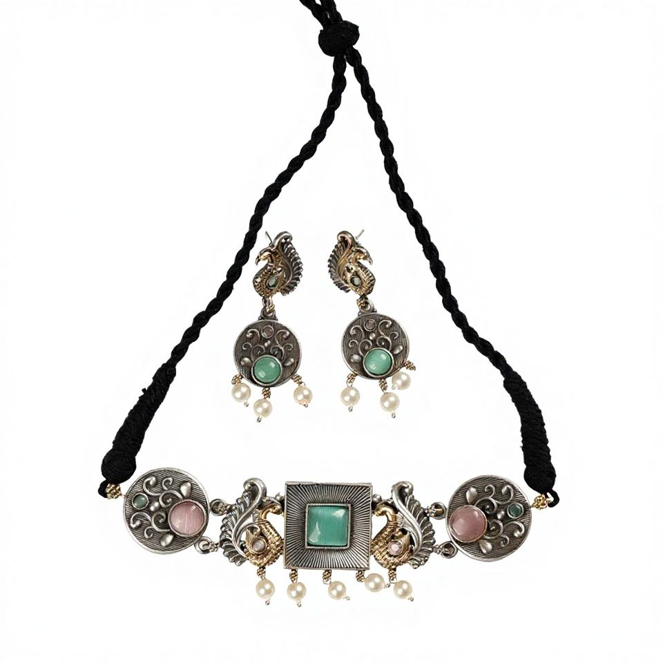 Two-tone oxidized choker with green stone