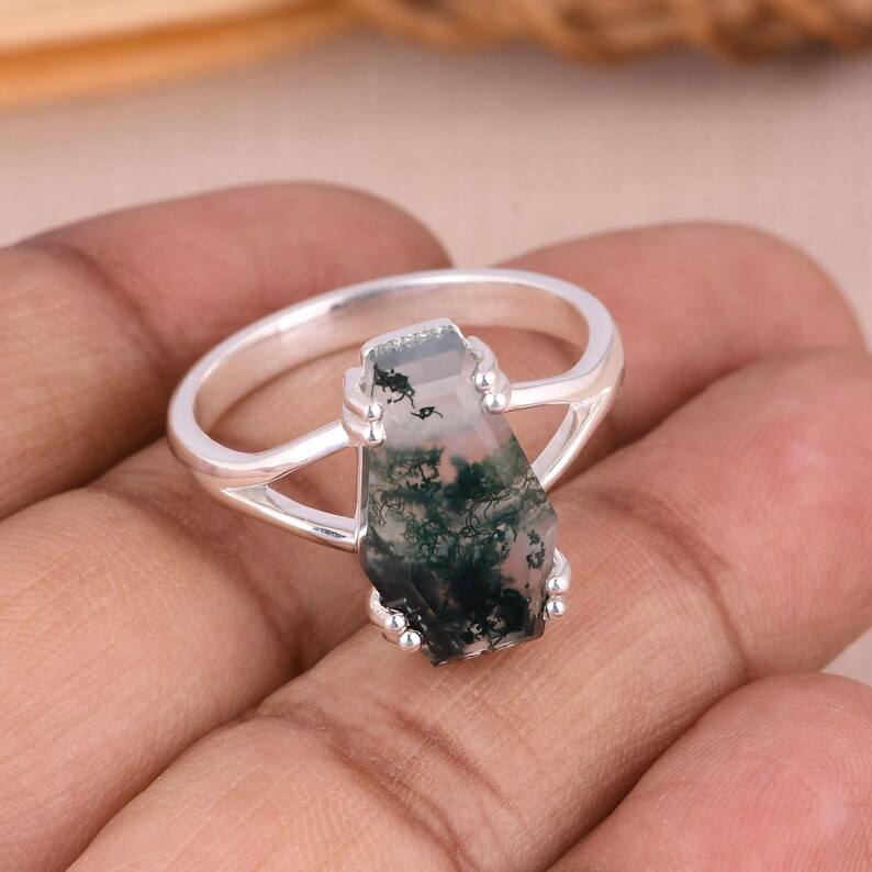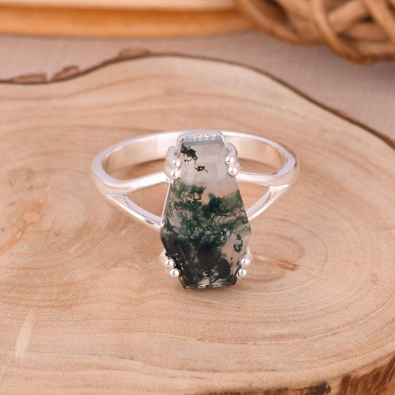 Oxidized Sterling Silver Natural Stone Moss Agate Coffin Ring Luxury Boho Southwestern Gothic Witchy Gemstone Ring Handmade Gift