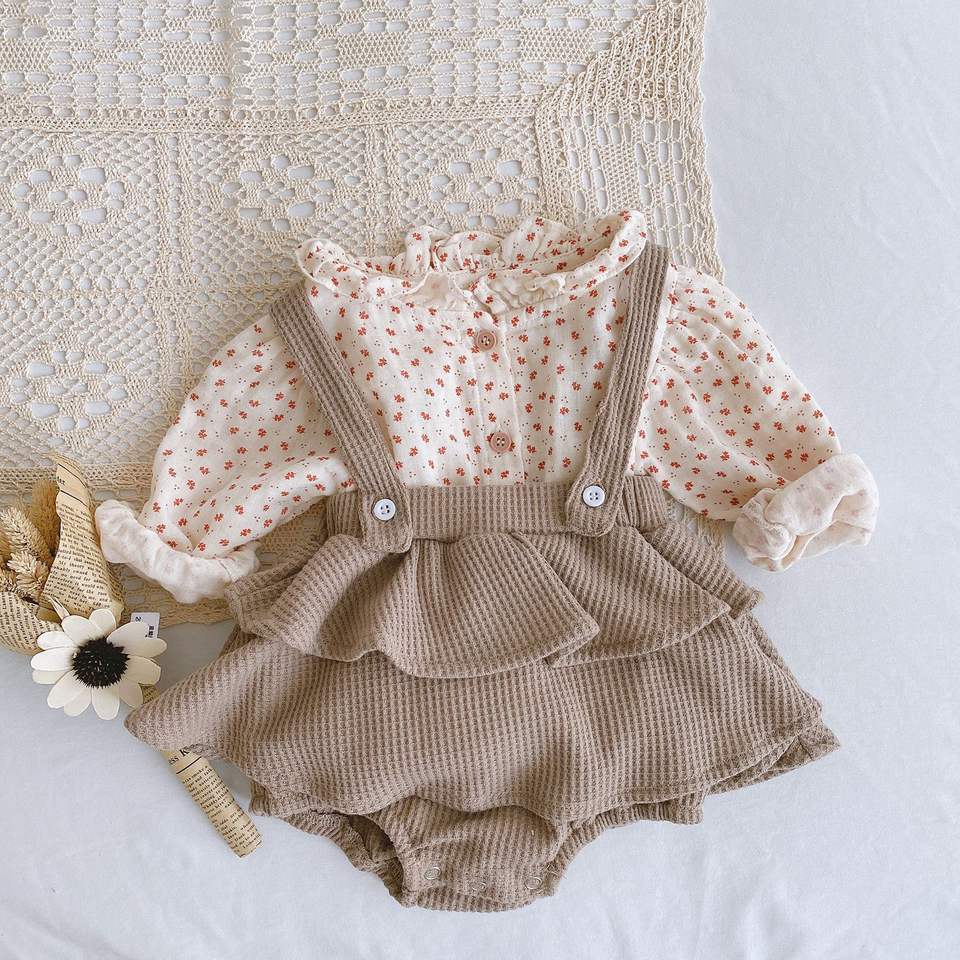 ชุดรอมเปอร์เด็กผู้หญิง P108044 0-2 ปี รุ่นฤดูใบไม้ผลิ สายเดี่ยวระบายชั้น 2 แบบใบบัว ชุดจั๊มสูทเด็กทารกและเด็กวัยหัดเดิน